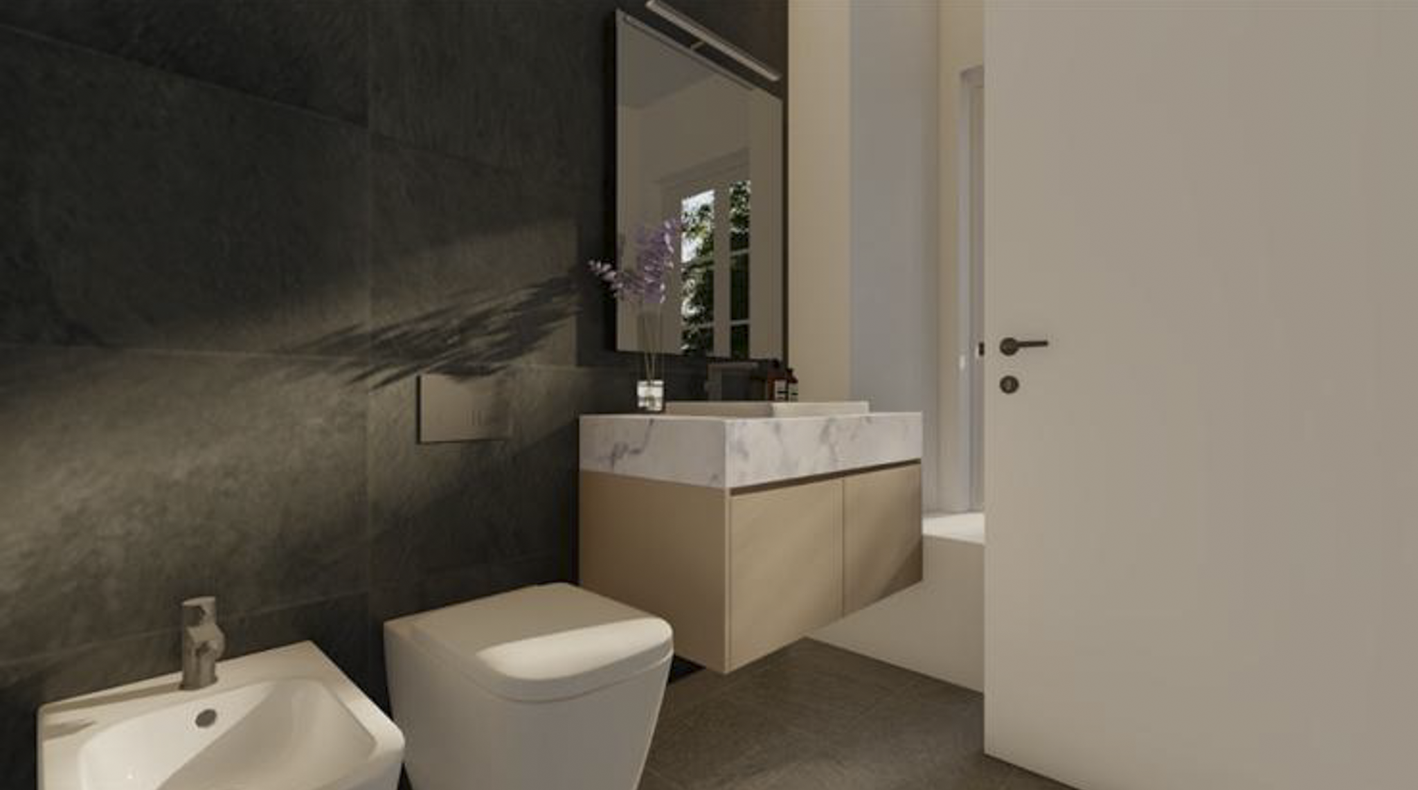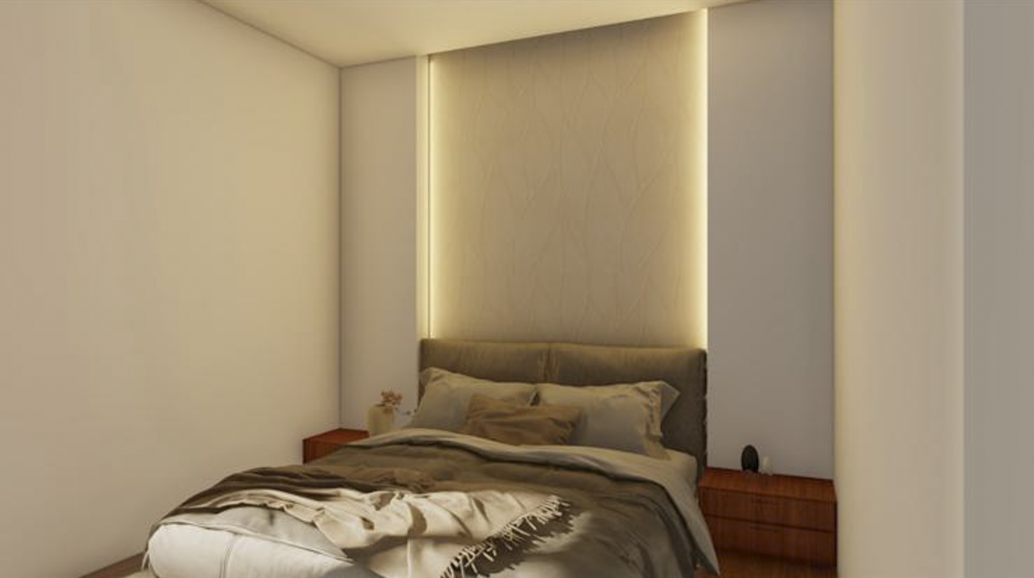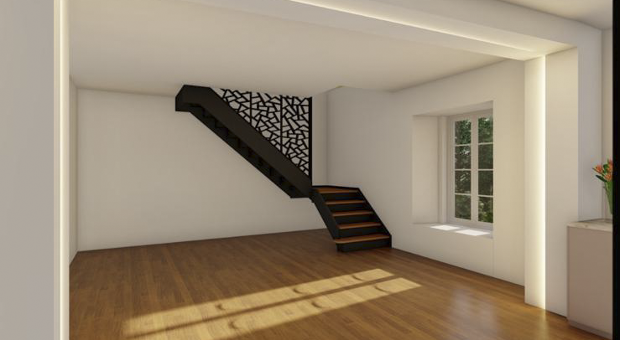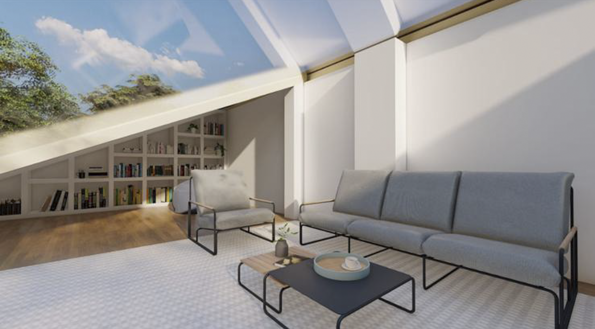 Het appartement is verdeeld over twee verdiepingen: de eerste verdieping beschikt over een lichte woonkamer met open keuken, een badkamer, een slaapkamer en de hoofdslaapkamer met eigen badkamer. Boven is er een grote zolderkamer die kan worden gebruikt als studeerkamer, hobbykamer of extra logeerkamer, waar een dakterras zal worden geplaatst.