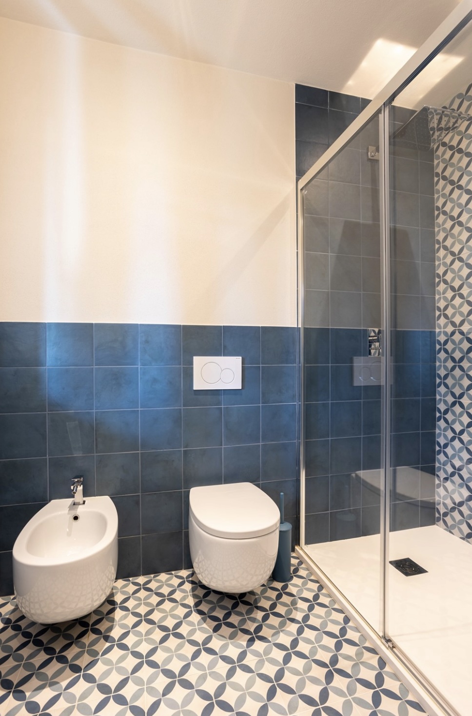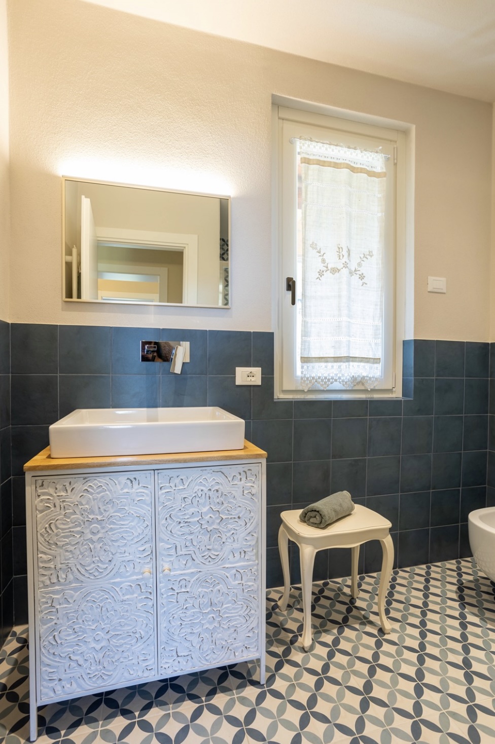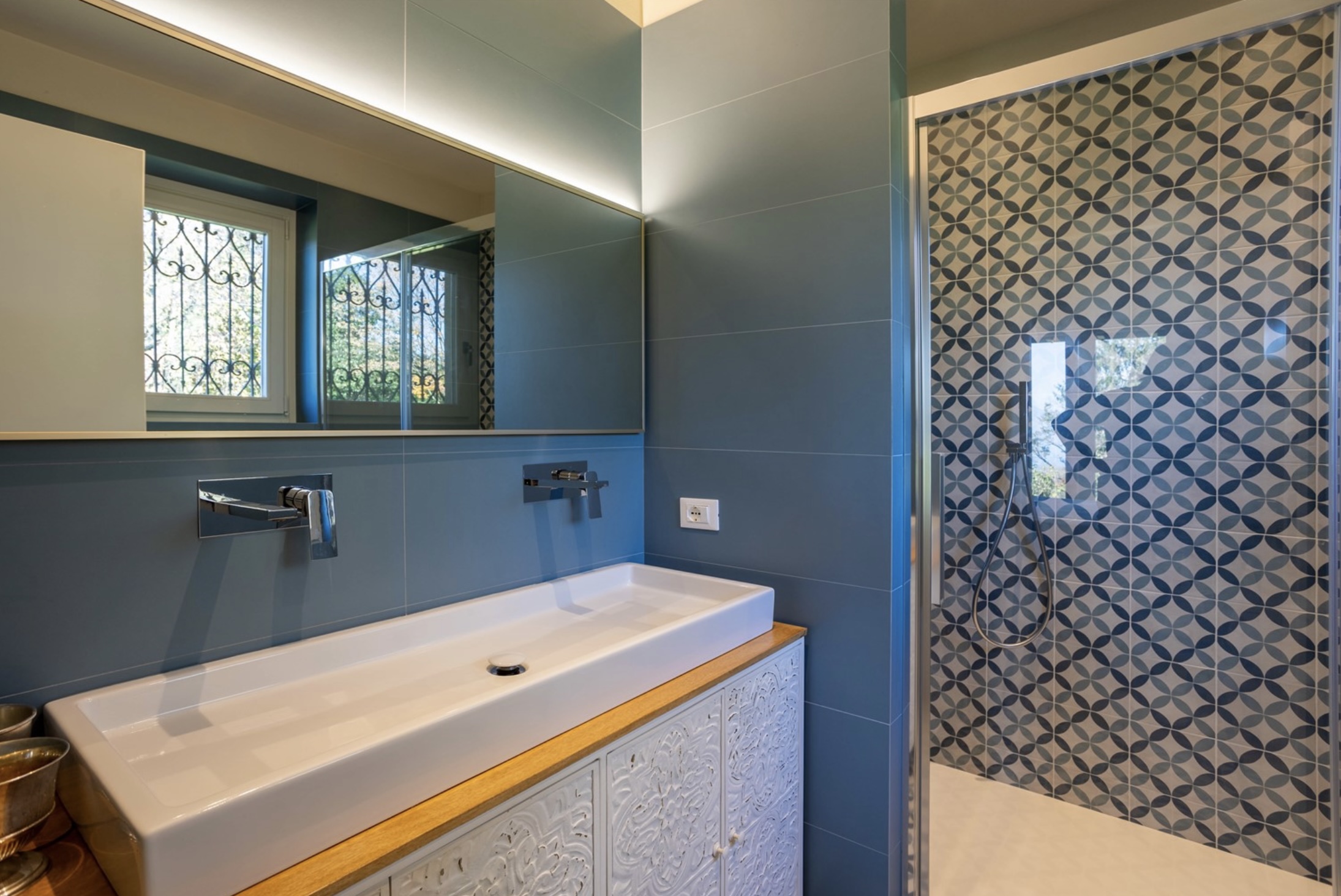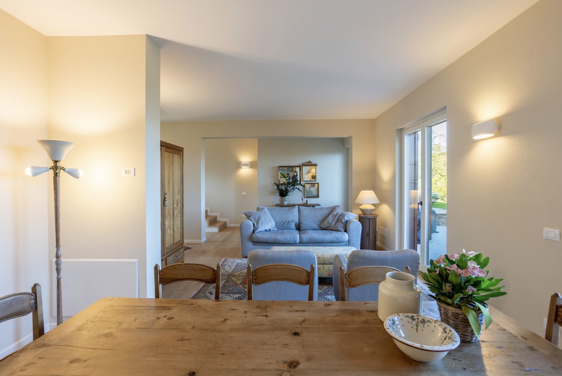 Op de benedenverdieping, zowel intern bereikbaar via een comfortabele houten trap als extern via een aparte ingang, bevindt zich een grote kelderruimte met een open haard en een bar met een kleine wijnkelder. Deze ruimte zou kunnen worden omgebouwd tot een mooie tv-kamer. De kelderruimte leidt naar een klein, zelfstandig appartement met een zitkamer, slaapkamer en badkamer. Op deze verdieping bevindt zich ook de garage.