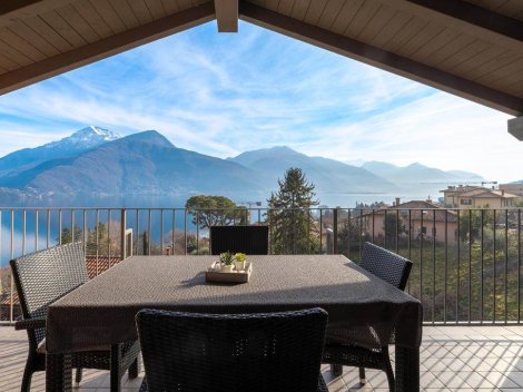 Comomeer - In Musso, op een zonnige locatie met spectaculair uitzicht op het meer, in een vrijstand pand met slechts 5 appartementen. bieden wij een prachtig penthouse van 100 m2 over de gehele bovenverdieping. Het appartement heeft een eigen ingang en is mooi afgewerkt met houten balken in zicht. Vanaf het ruime terras kunt u genieten van het prachtige panoramische uitzicht!