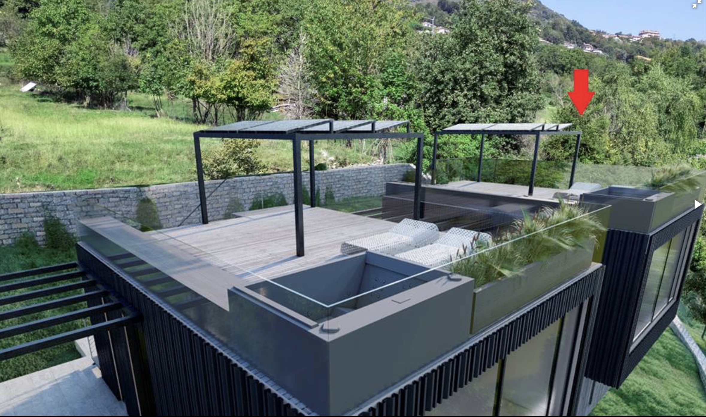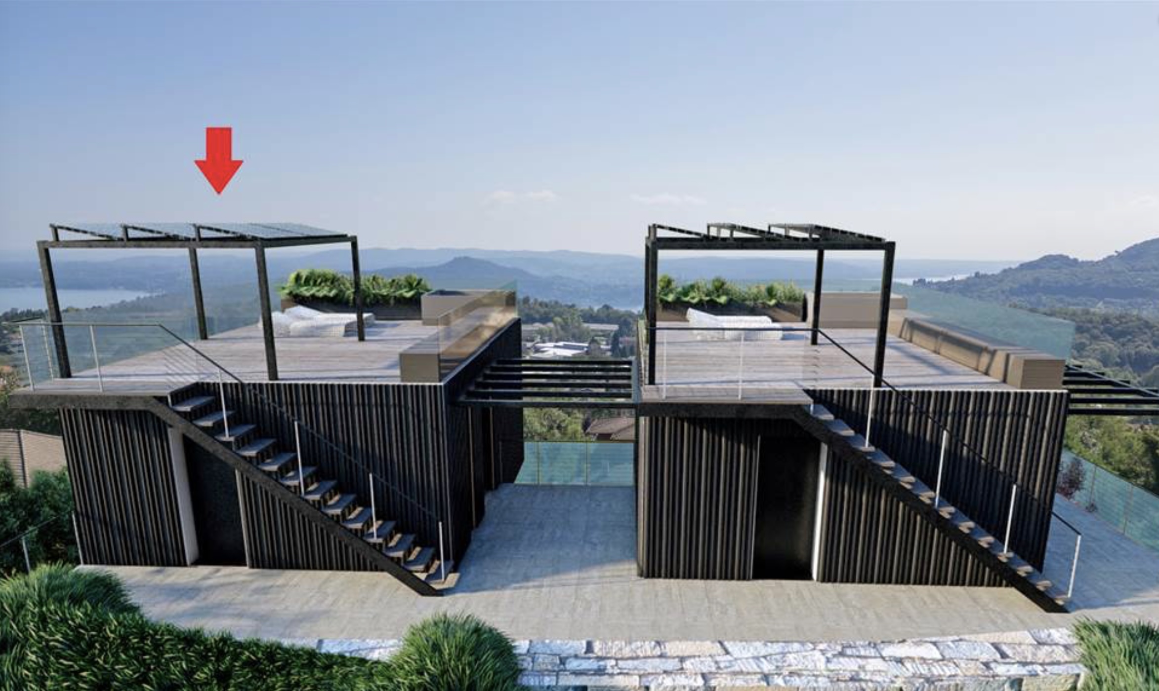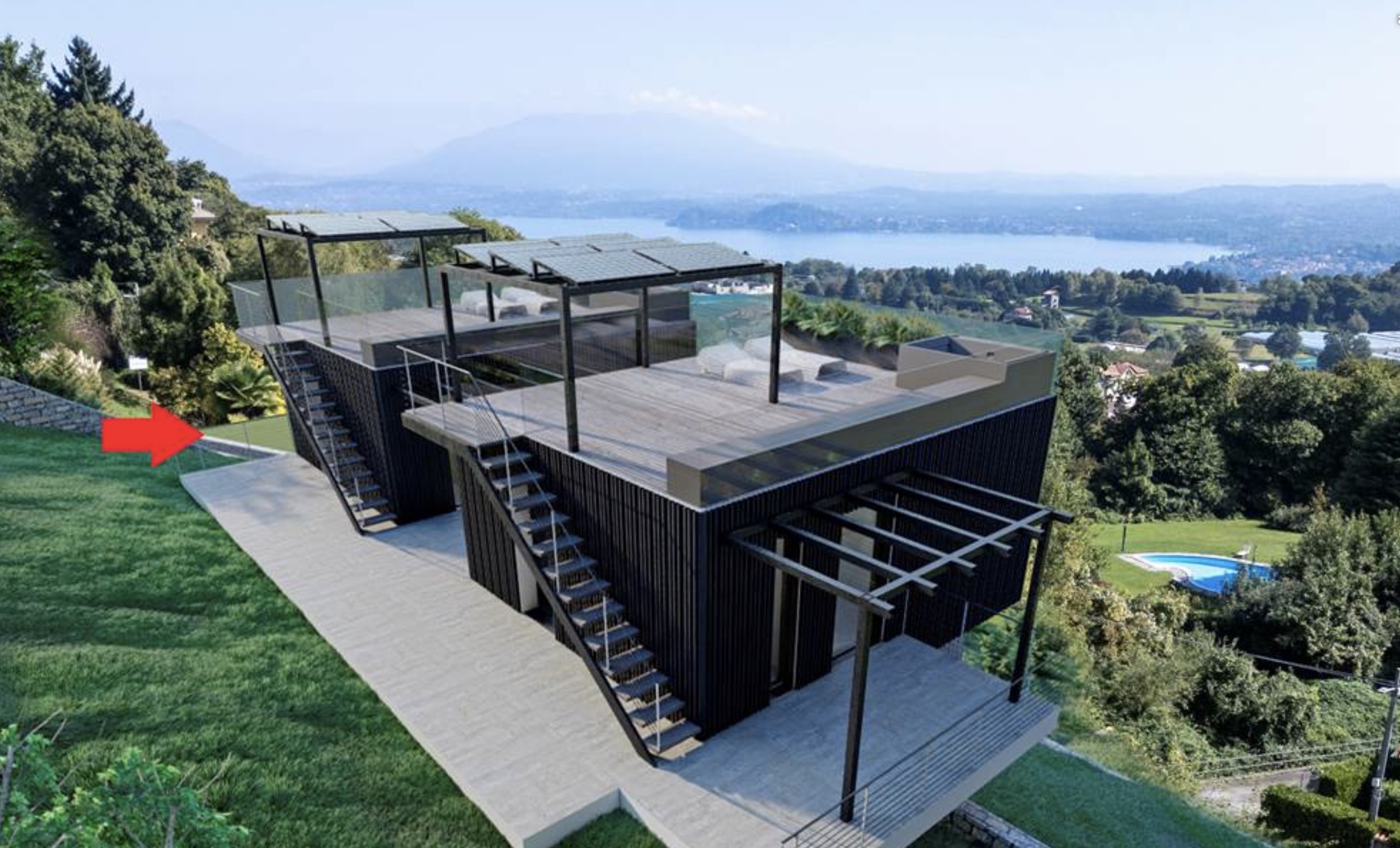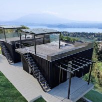 De woning wordt gekenmerkt door strakke lijnen en grote panoramische raampartijen met een adembenemend 180° uitzicht over het meer. Dankzij de royale glaspartijen, zwevende geometrische volumes en het gebruik van natuurlijke materialen ontstaat een perfecte balans tussen esthetiek en functionaliteit, volledig geïntegreerd in het heuvelachtige landschap.