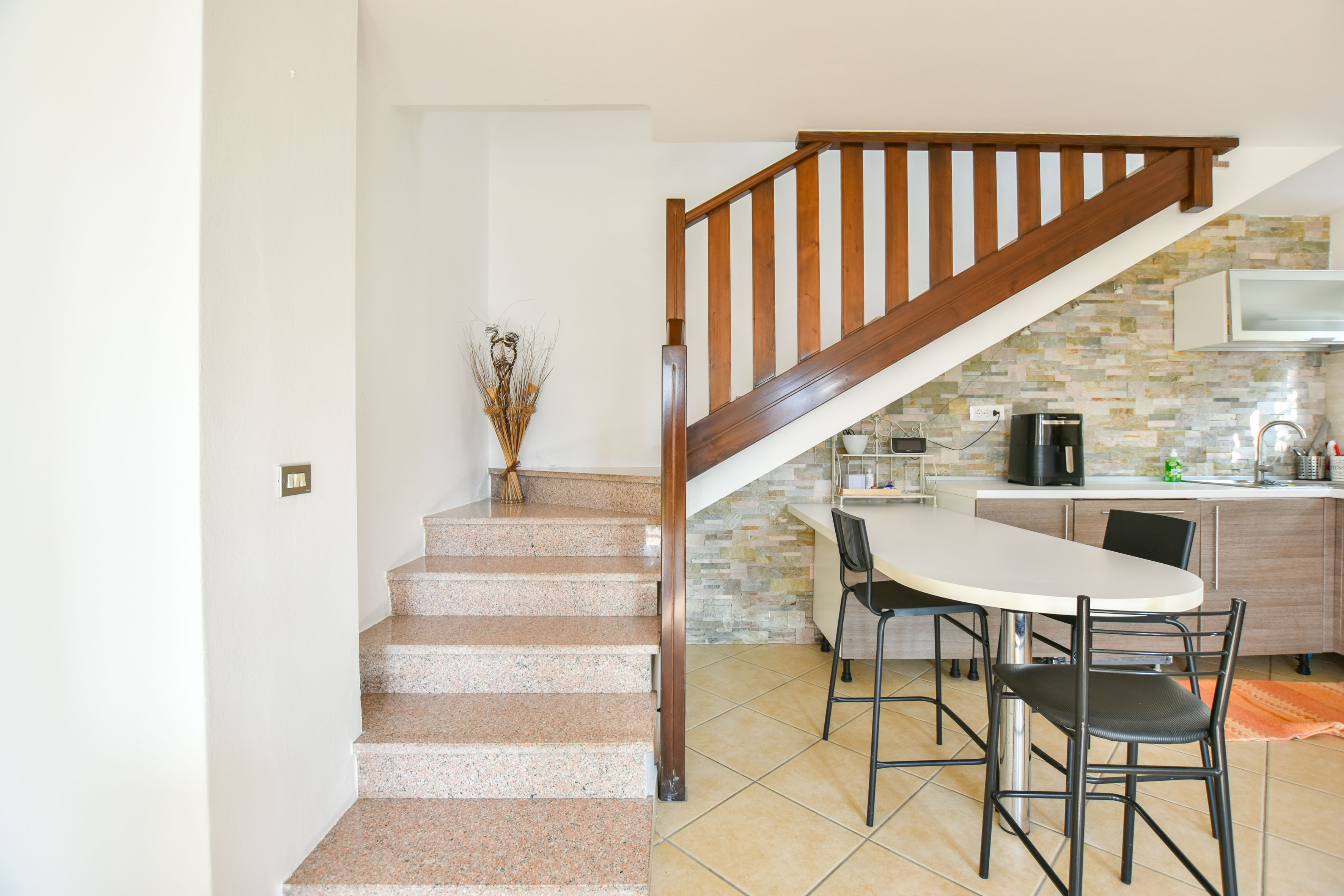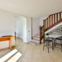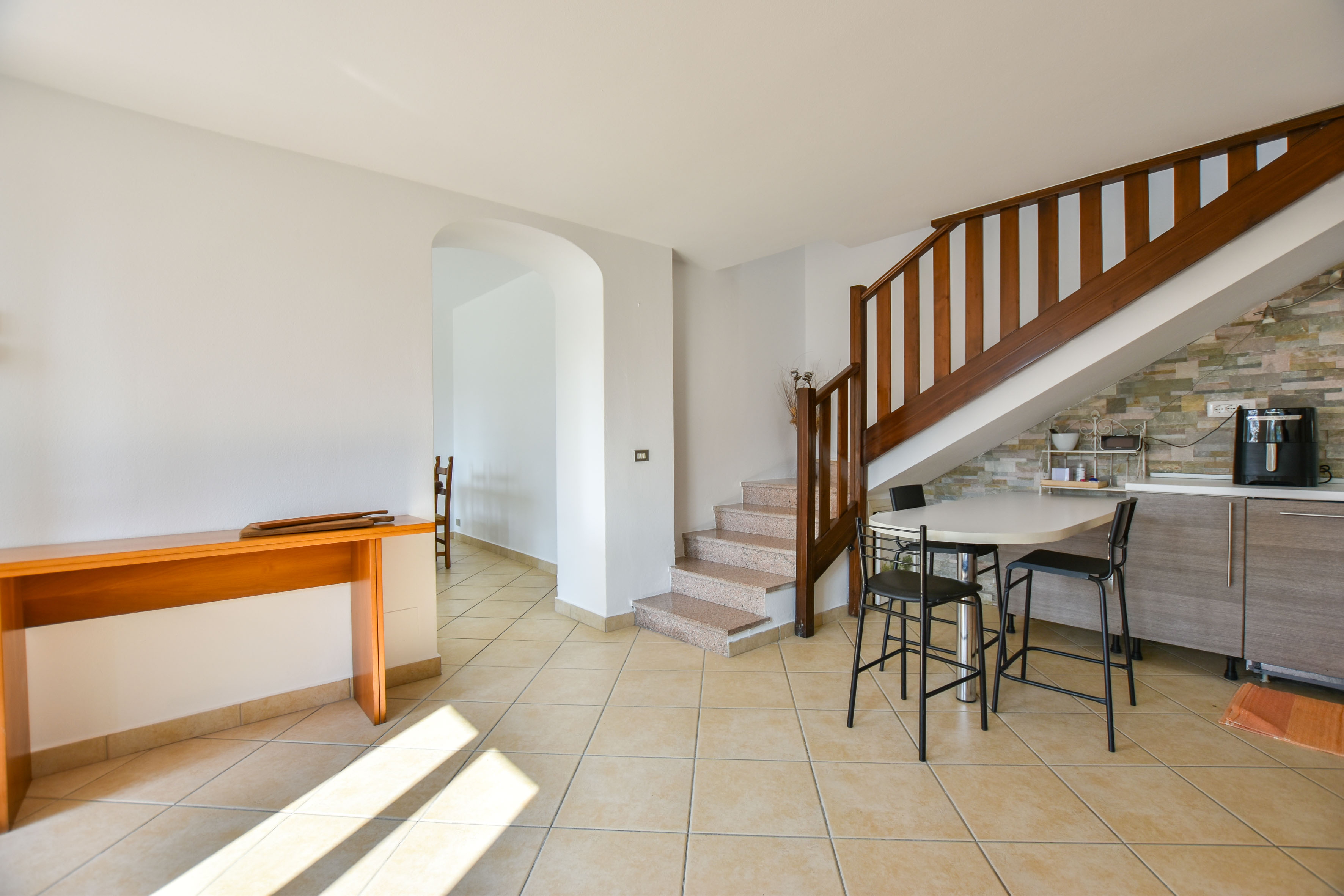 Op de begane grond bevindt zich een ruime leefruimte met open keuken, een badkamer met douche en een tweede leefruimte die dankzij de royale afmetingen en het open uitzicht eenvoudig kan worden omgevormd tot een slaapkamer. De veranda, direct toegankelijk vanuit zowel de keuken als de woonkamer, is ideaal om buiten te eten en te genieten van de stilte van de omgeving.
