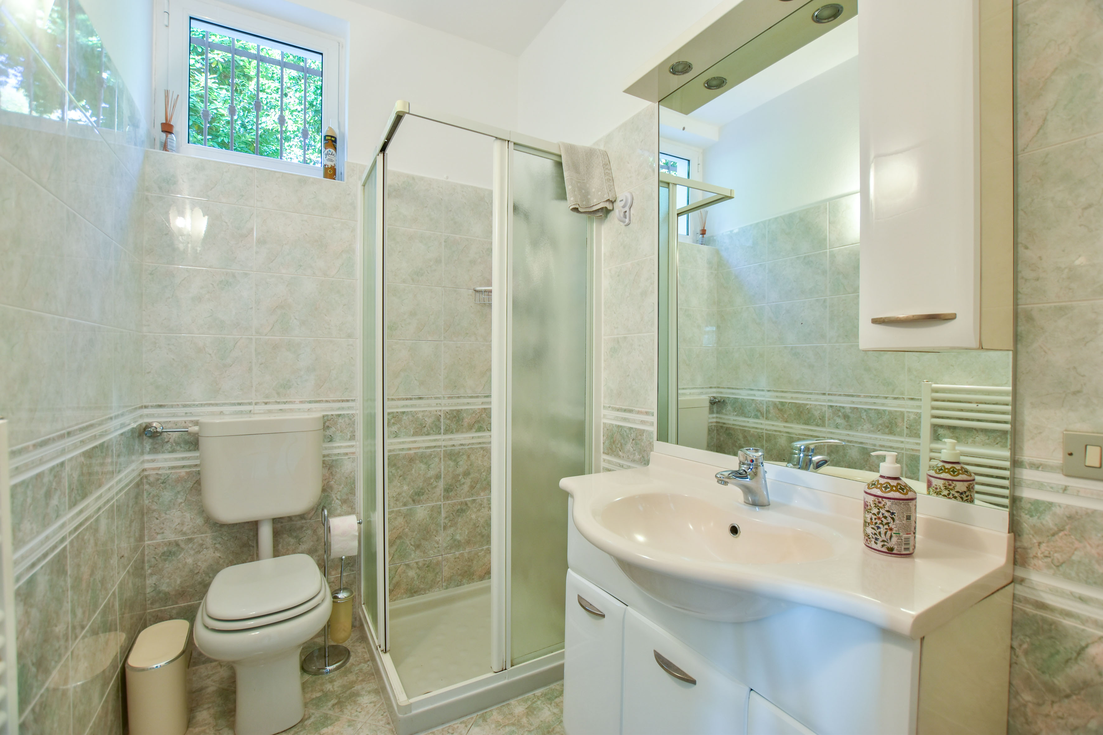 Op de bovenverdieping bevindt zich een slaapkamer met open uitzicht en een badkamer met ligbad. De vloeren op de begane grond en in de badkamers zijn uitgevoerd in keramische tegels, terwijl de slaapkamer op de bovenverdieping is voorzien van een laminaatvloer. De aluminium ramen met dubbele beglazing zorgen voor uitstekende thermische en akoestische isolatie.