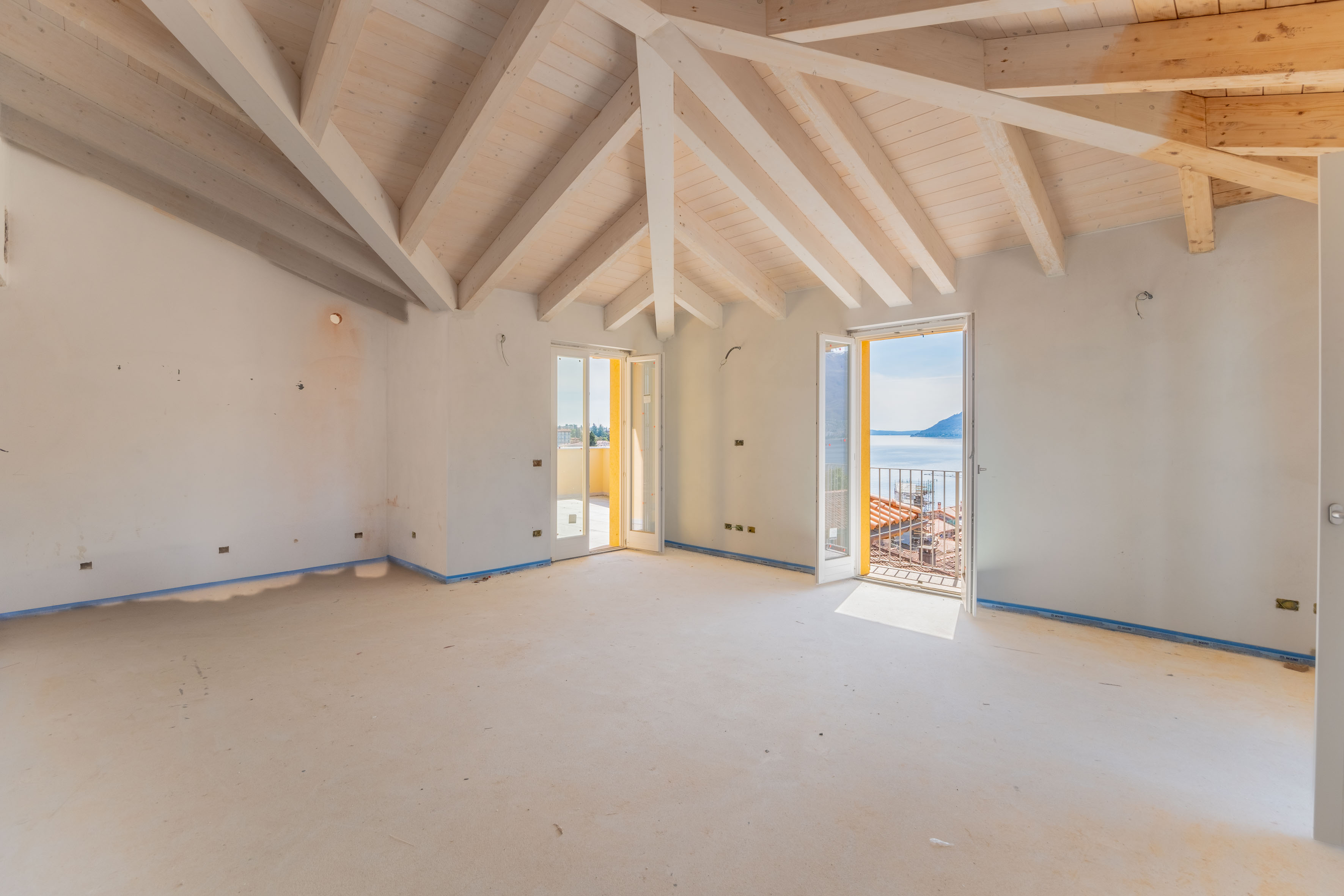 Het penthouse onderscheidt zich door zijn lichtinval en het grote terras met uitzicht op het meer, ideaal voor ontspannende momenten of diners in de buitenlucht tijdens de zomermaanden. De ruime en uitnodigende leefruimte staat in directe verbinding met buiten en sluit aan op een aparte keuken, ontworpen voor wie houdt van goed georganiseerde en functionele ruimtes.