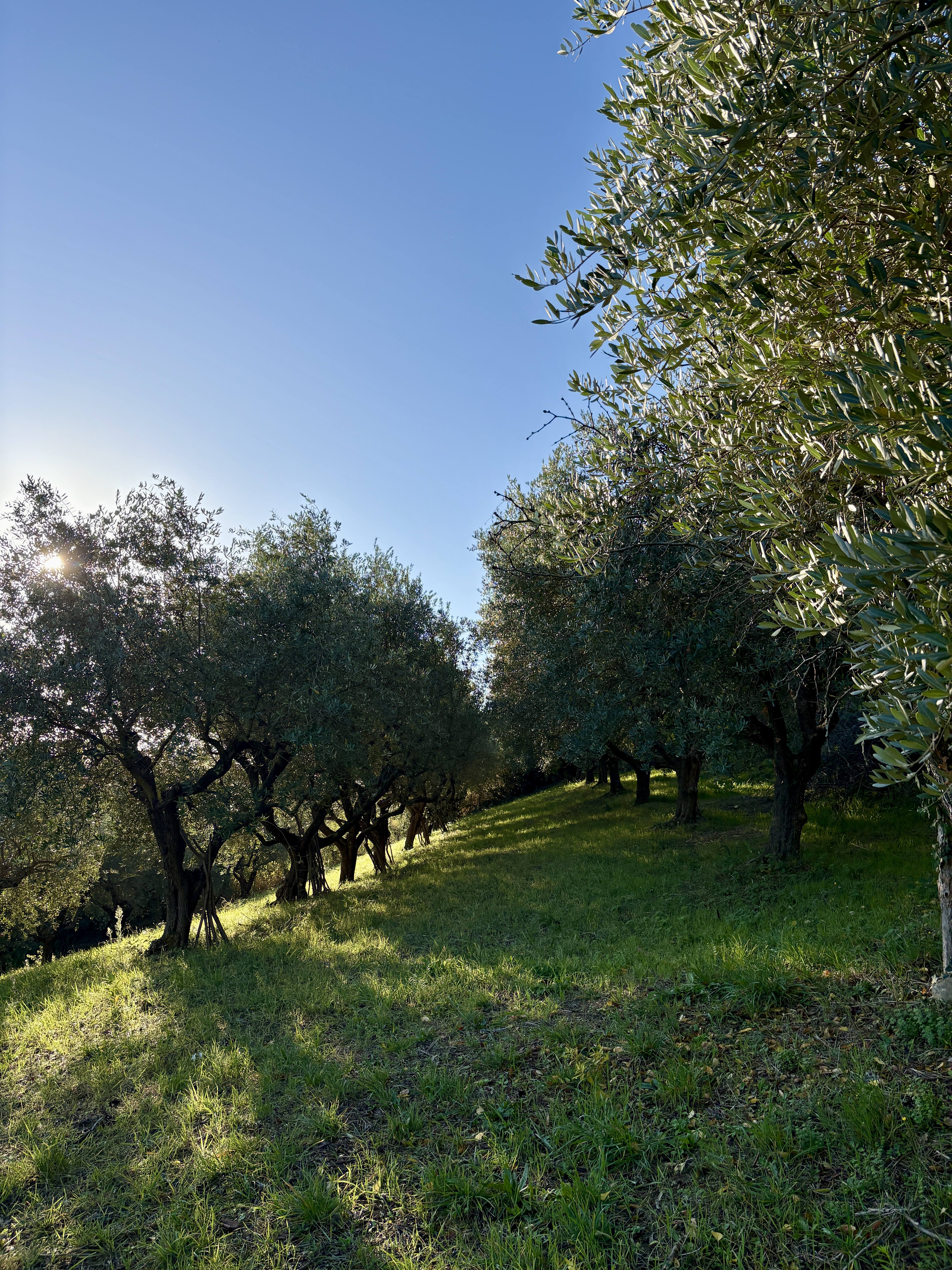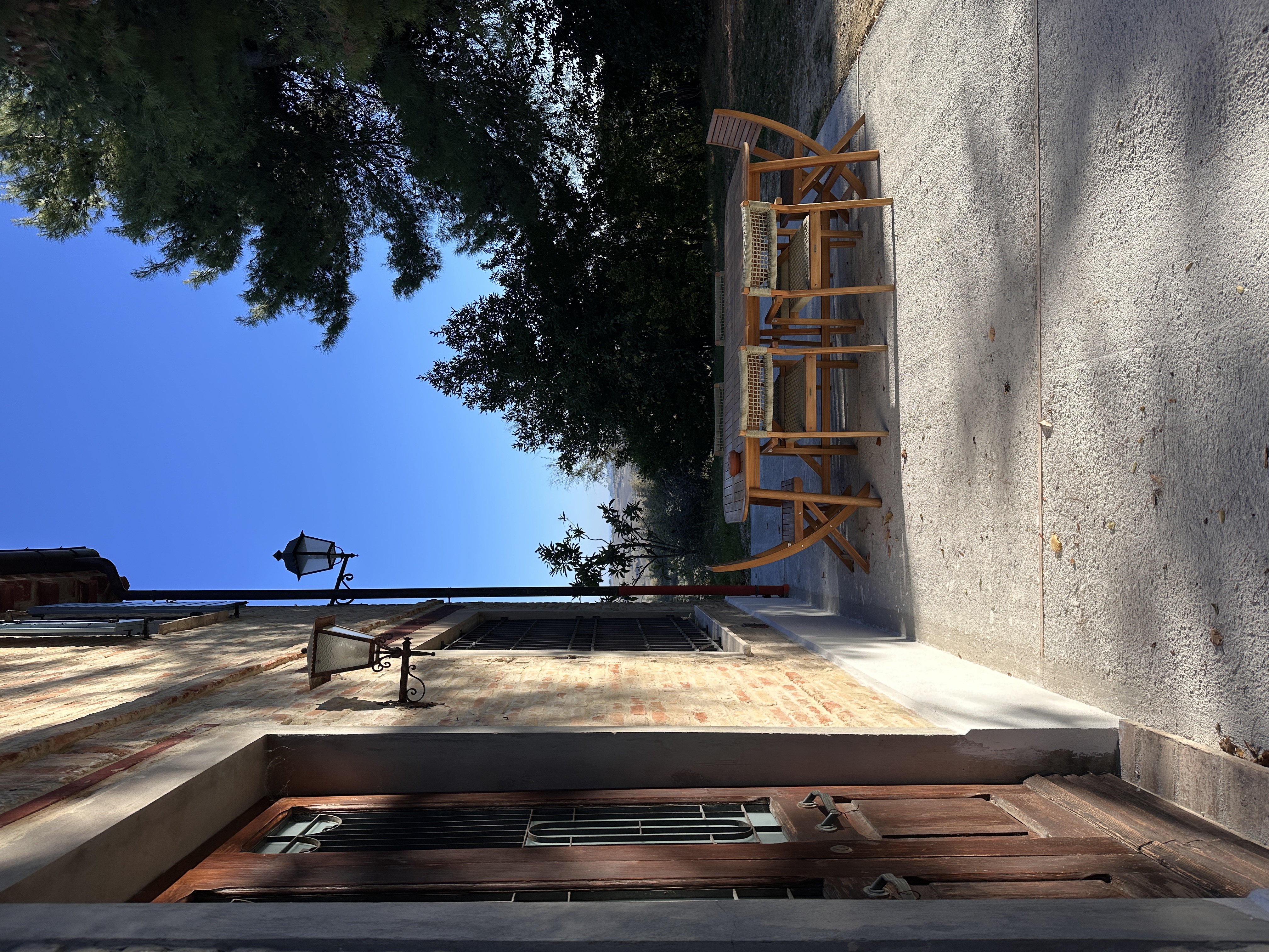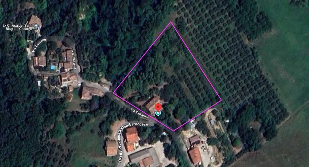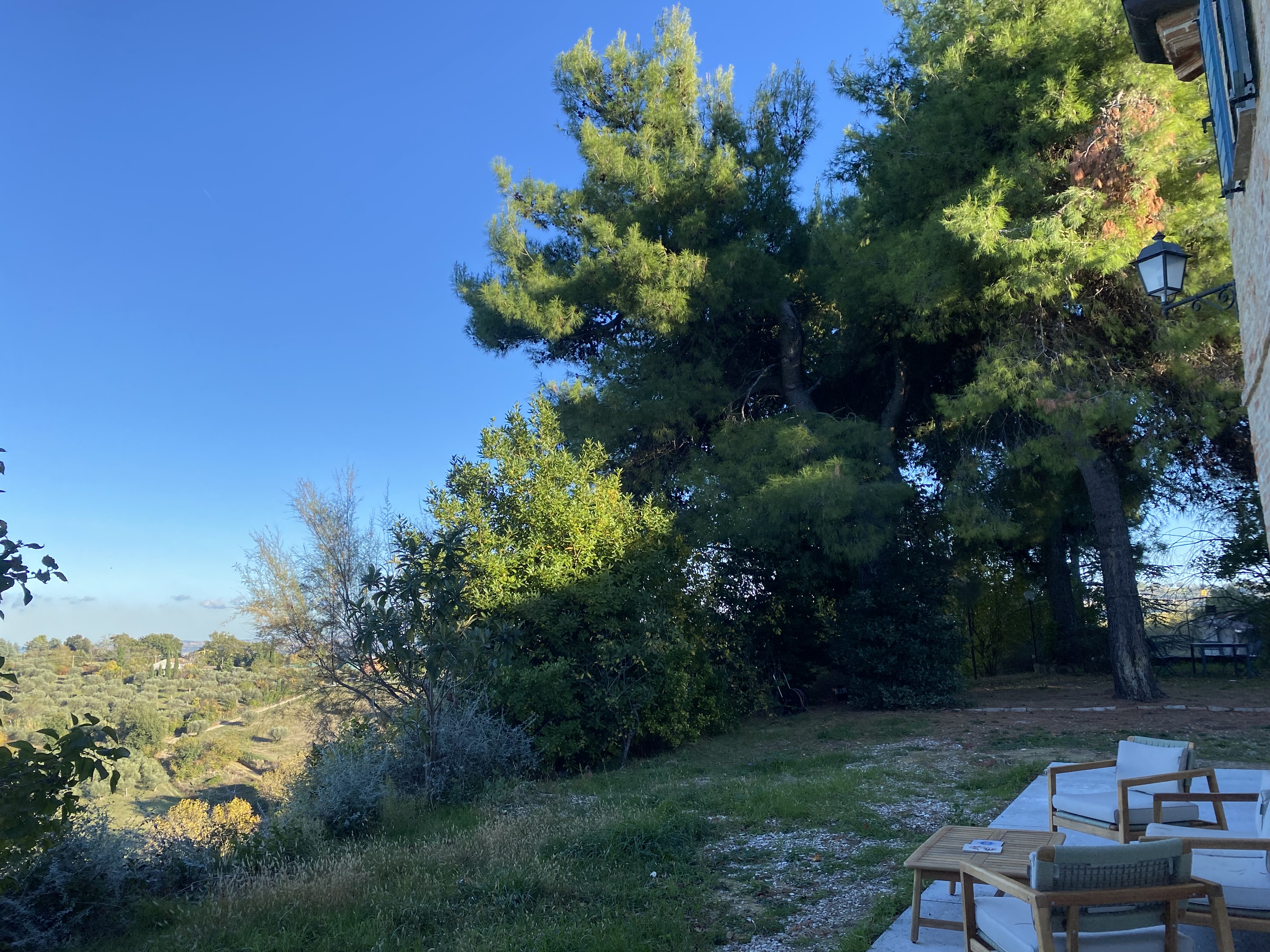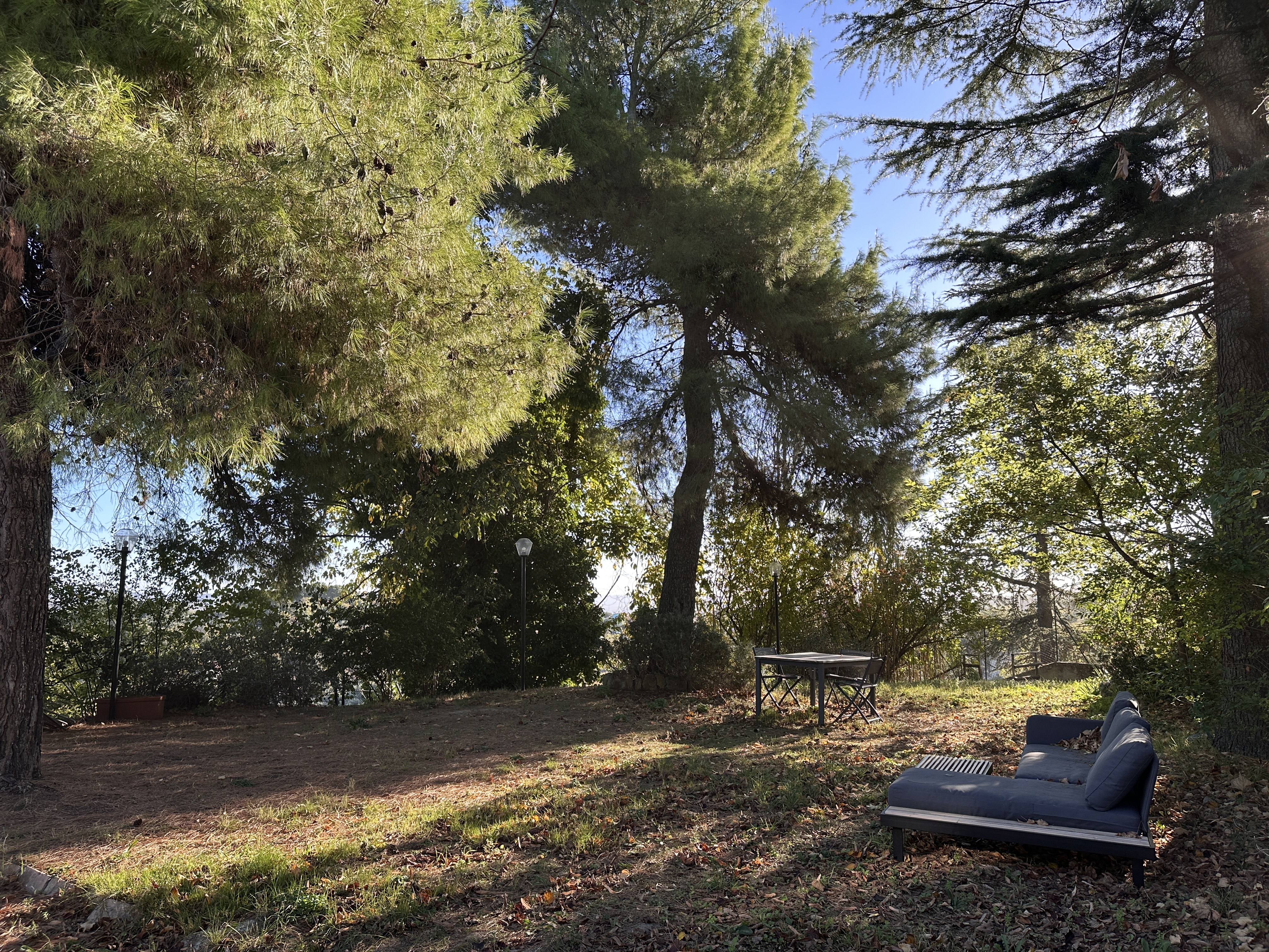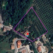 Aan 2 zijden van het huis is onlangs een fijn en ruim terras gemaakt, vanuit de vrij vlakke tuin rondom het huis is er op heldere dagen zicht op zee. De boomgaard met diverse fruit- en pijnbomen en 70 volwassen olijfbomen ligt iets lager. Het terrein met een oppervlakte van 5.561 m² is volledig omheind. Hoewel het huis niet afgelegen ligt, biedt het perceel maximale privacy. De woning is gemakkelijk bereikbaar via een zeer rustig geasfalteerd weggetje, toegang tot het huis via 2 toegangshekken.