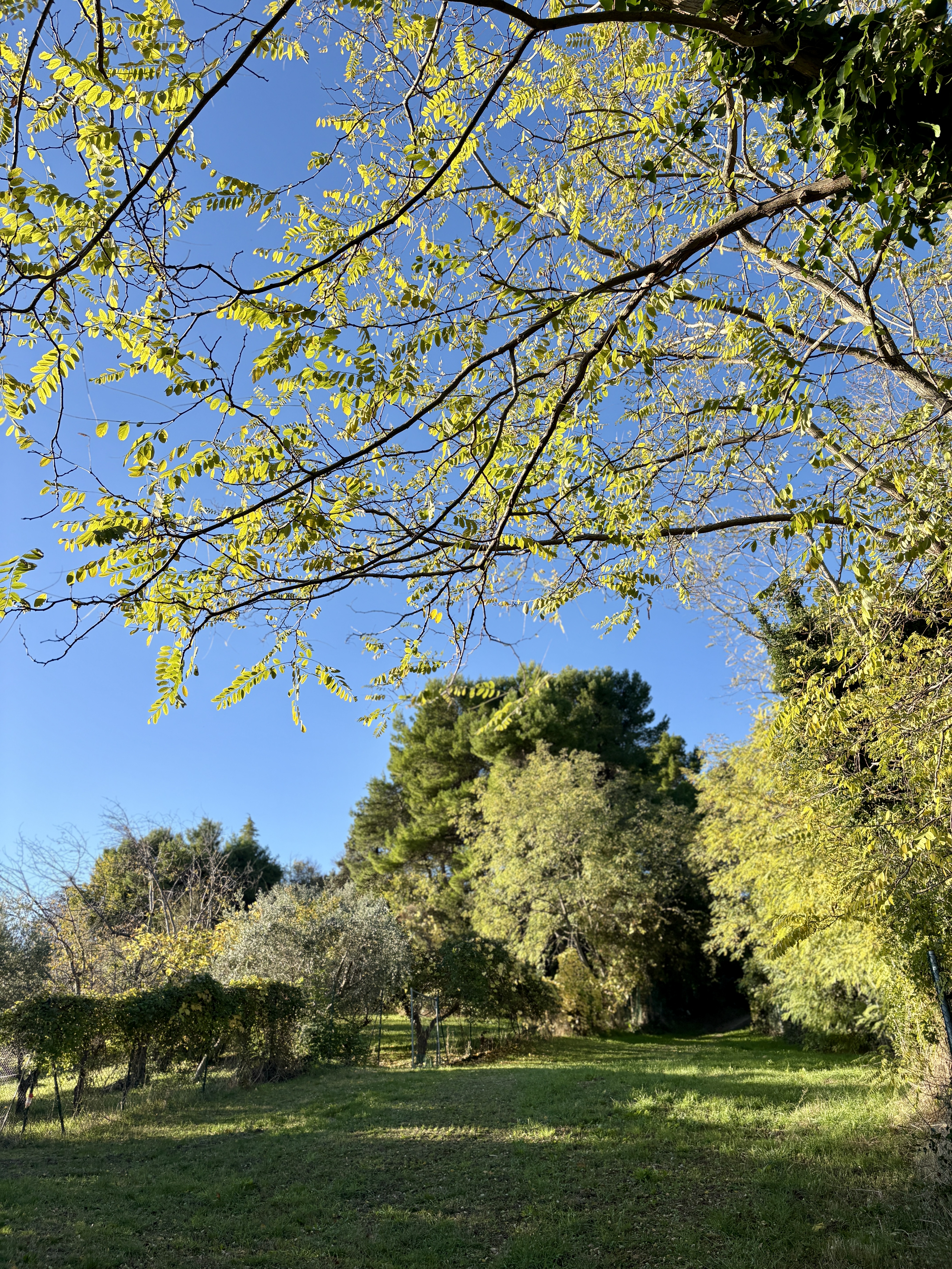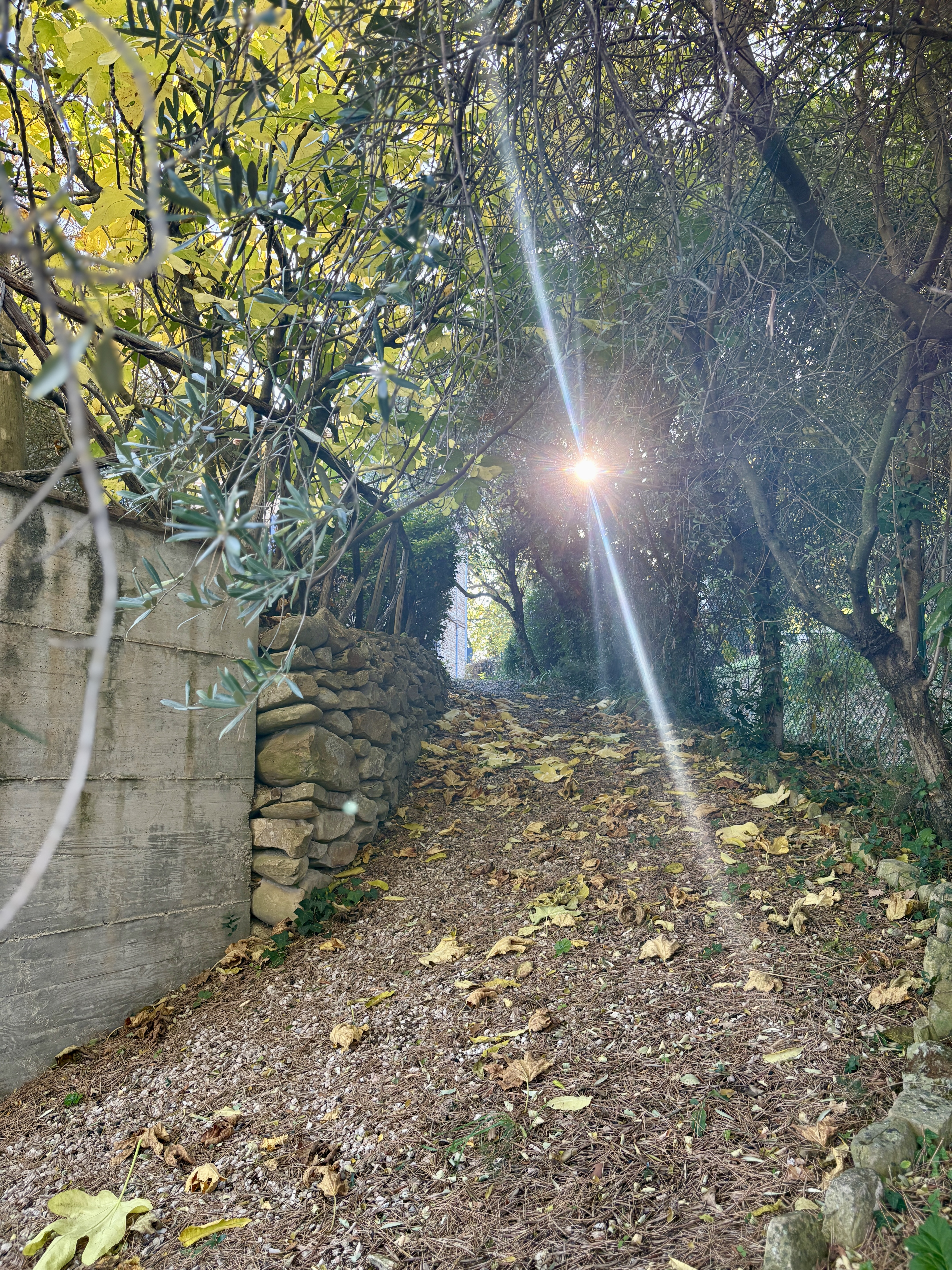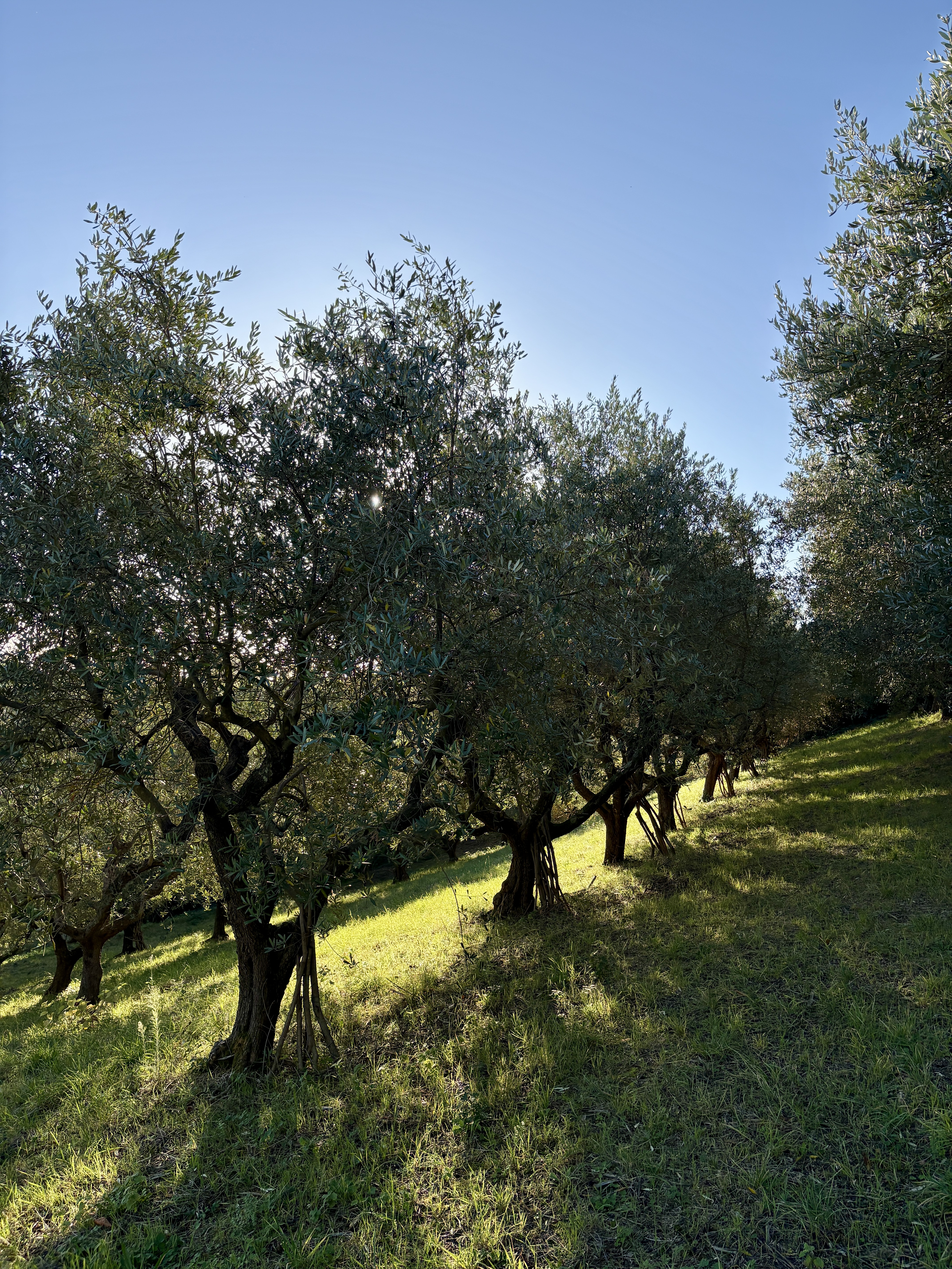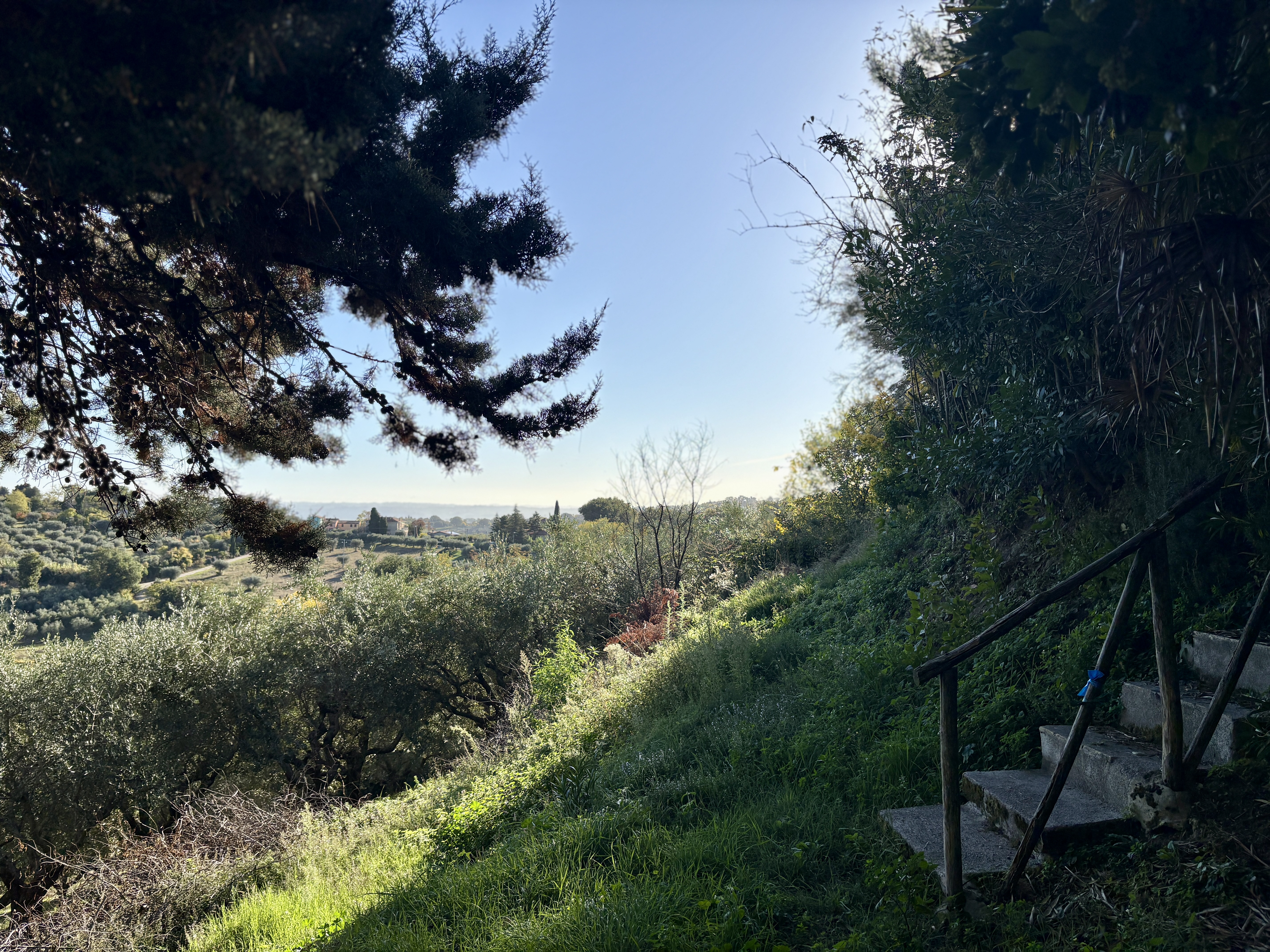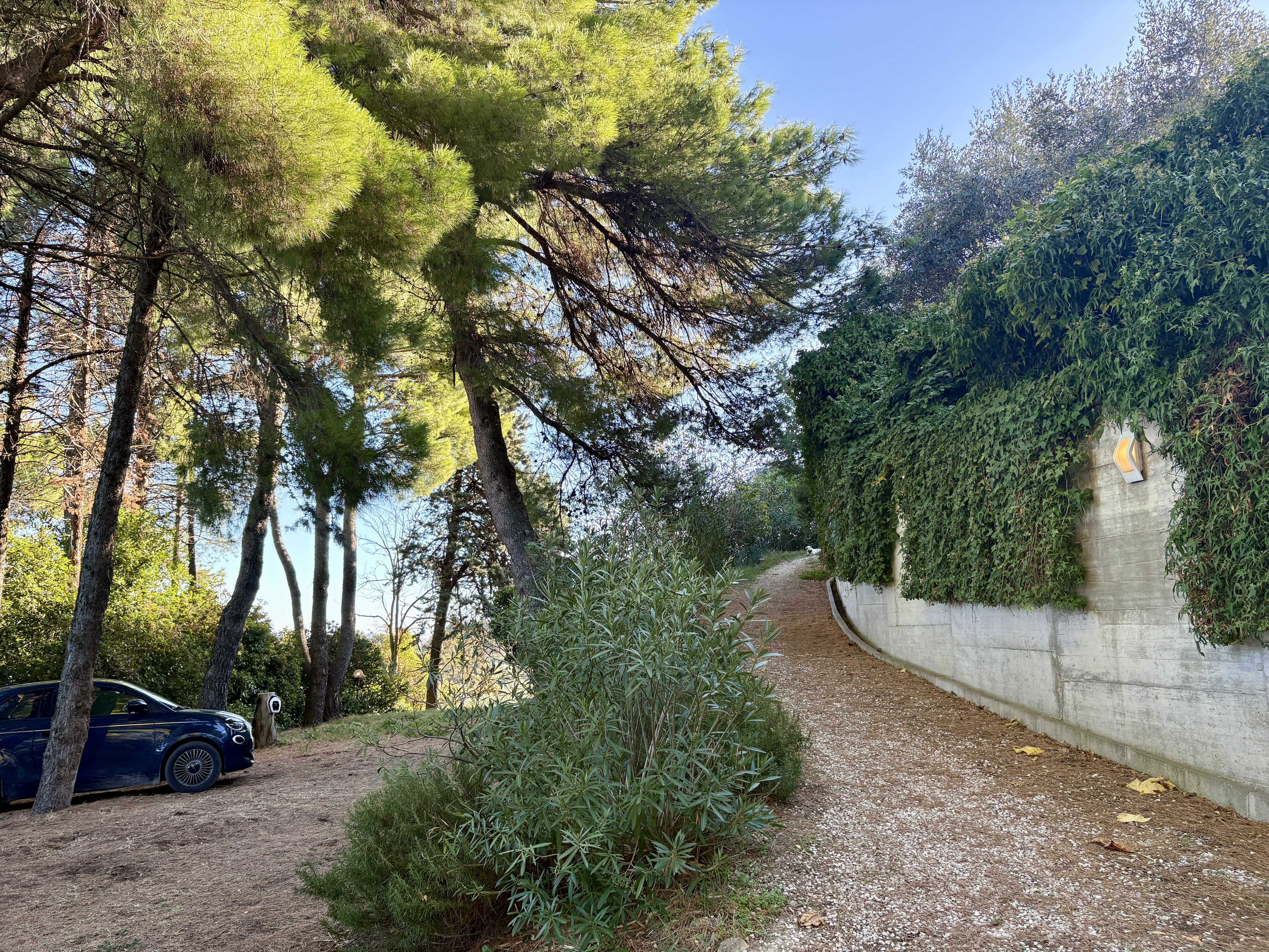 Aan 2 zijden van het huis is onlangs een fijn en ruim terras gemaakt, vanuit de vrij vlakke tuin rondom het huis is er op heldere dagen zicht op zee. De boomgaard met diverse fruit- en pijnbomen en 70 volwassen olijfbomen ligt iets lager. Het terrein met een oppervlakte van 5.561 m² is volledig omheind. Hoewel het huis niet afgelegen ligt, biedt het perceel maximale privacy. De woning is gemakkelijk bereikbaar via een zeer rustig geasfalteerd weggetje, toegang tot het huis via 2 toegangshekken.