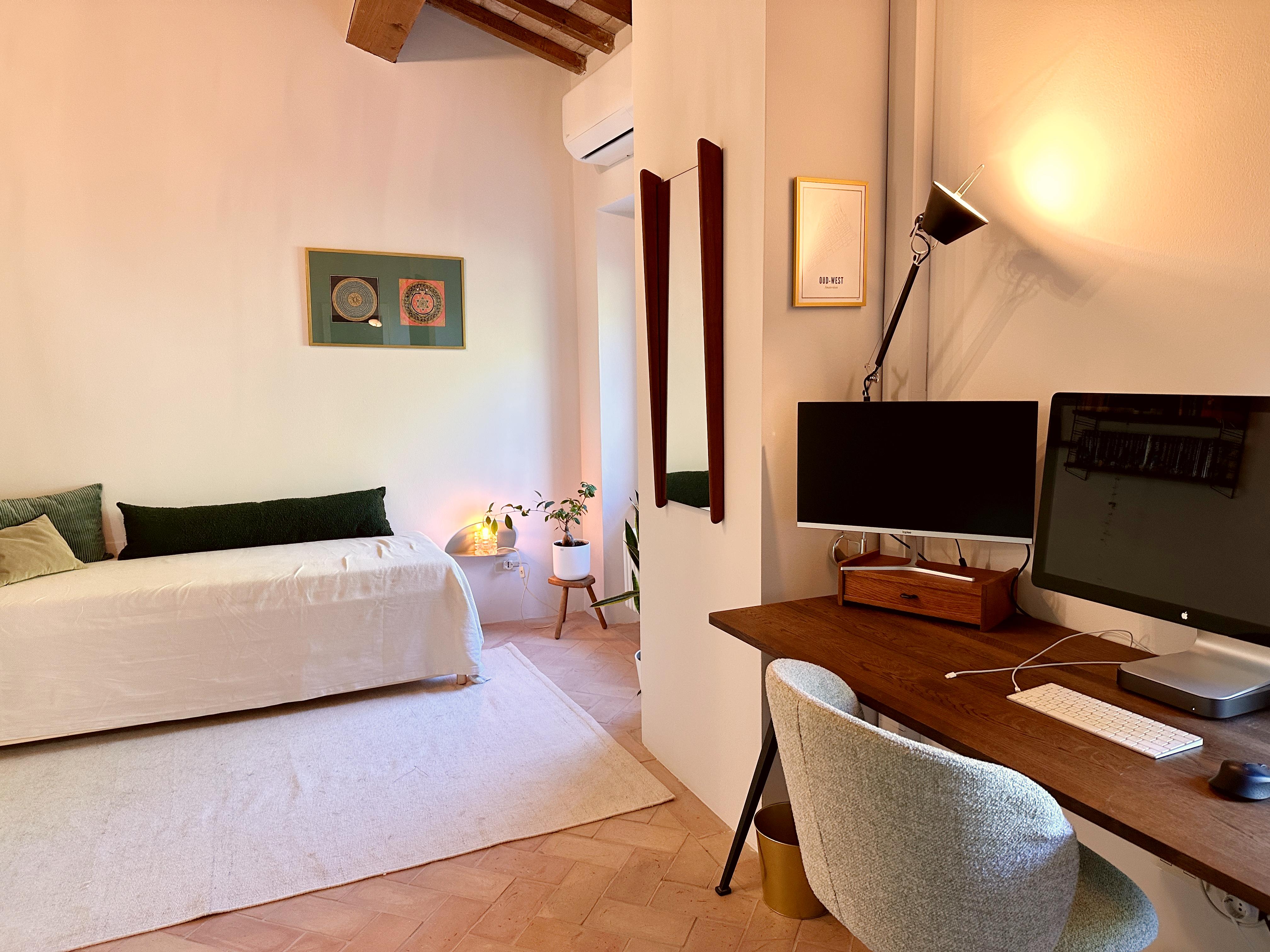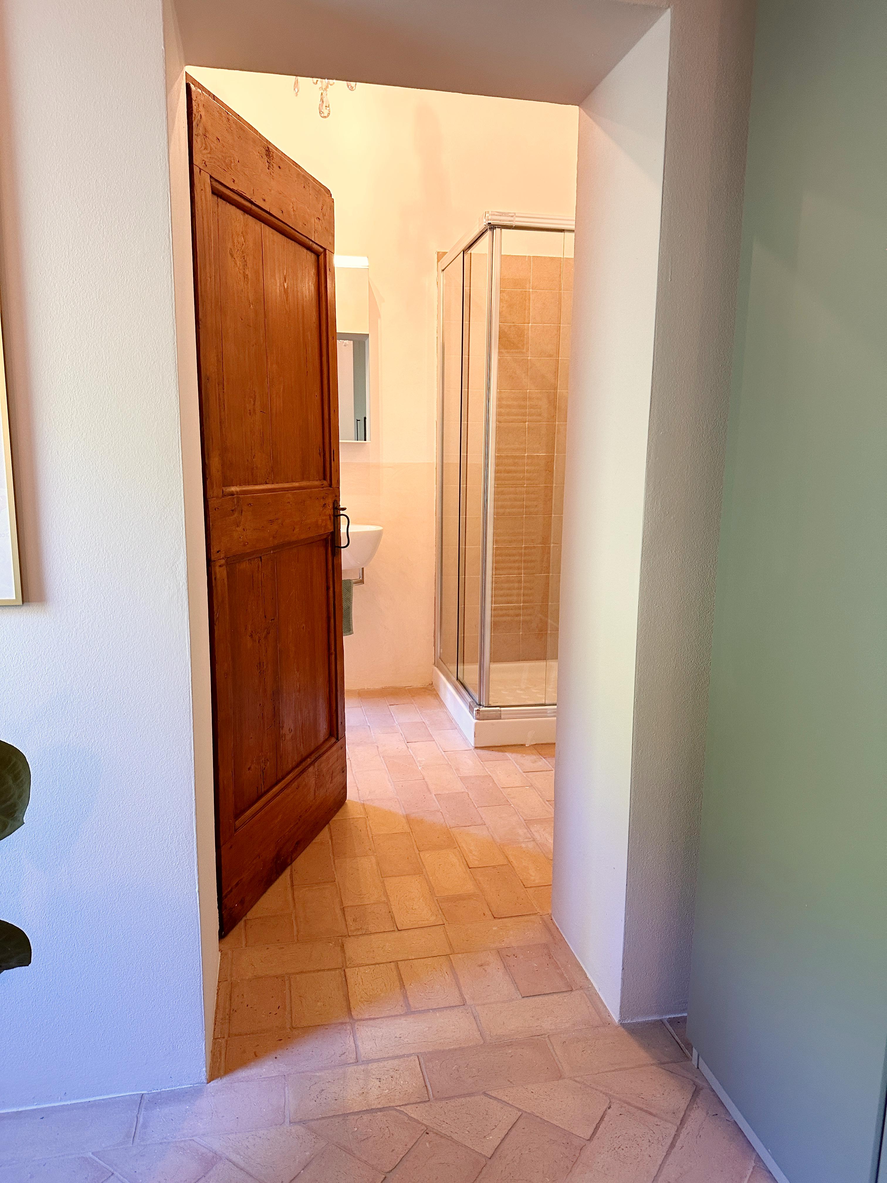 Eerste verdieping: overloop, 4 slaapkamers (momenteel zijn er 2 in gebruik als studeer/werkkamer), elk met een eigen badkamer. Typisch voor deze verdieping zijn de houten balkenplafonds en terracotta vloertegels.