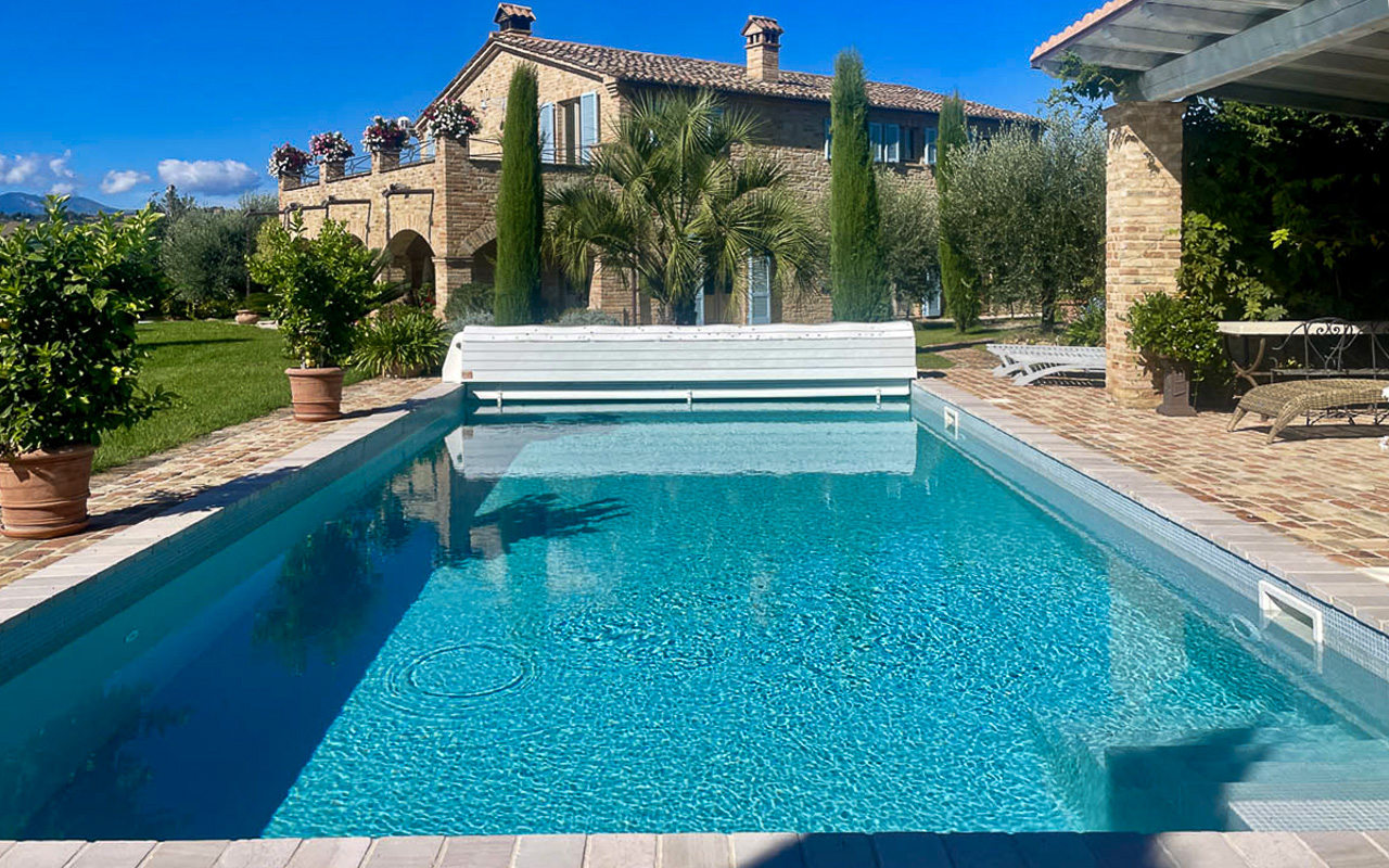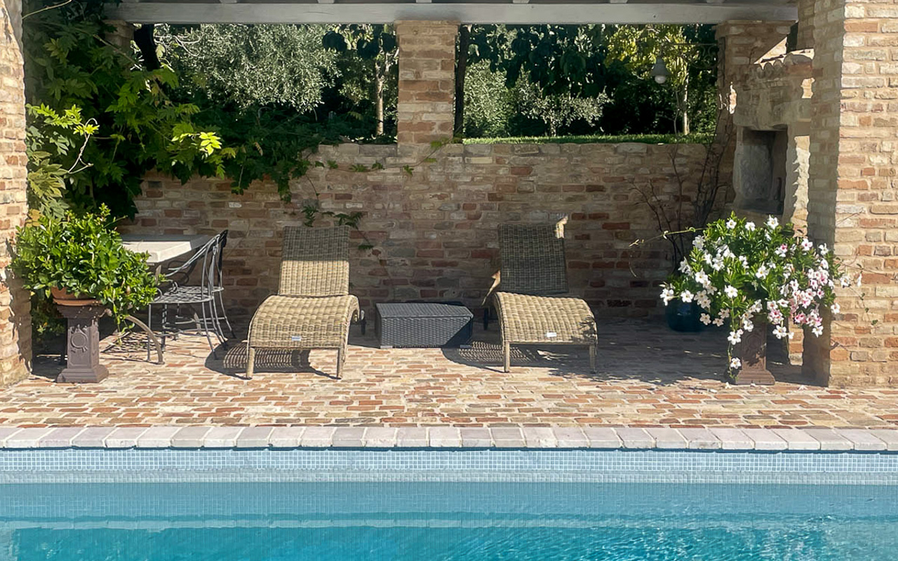 Het middelpunt van het buitengedeelte is een zwembad van 5 x 10 meter, omgeven door een terracotta terras met randen van Trani-steen. Een charmante portico met open haard biedt een heerlijke plek om buiten te eten of te ontspannen. Het zwembad is voorzien van een elektrische afdekking voor zomer en winter en een warmtepomp, zodat het het hele jaar door gebruikt kan worden.