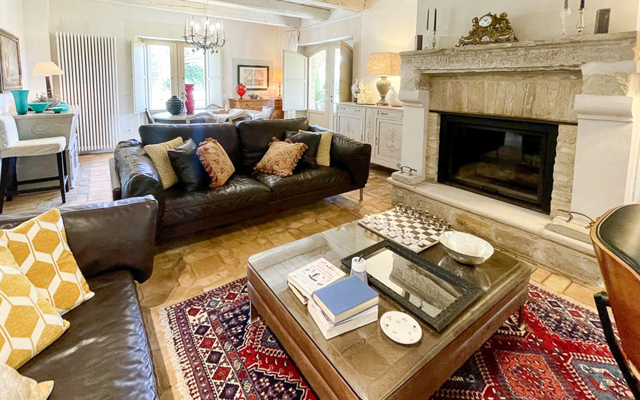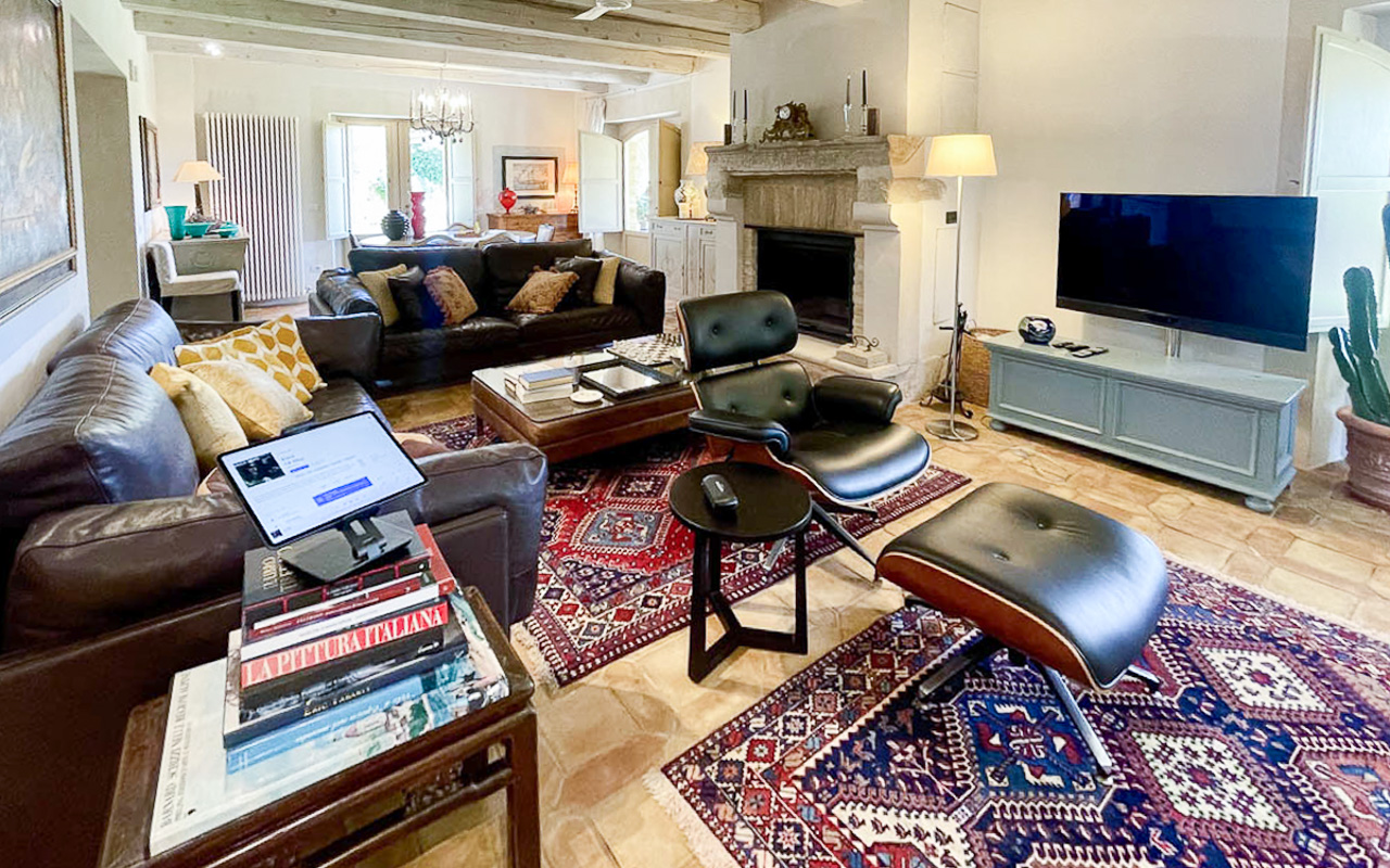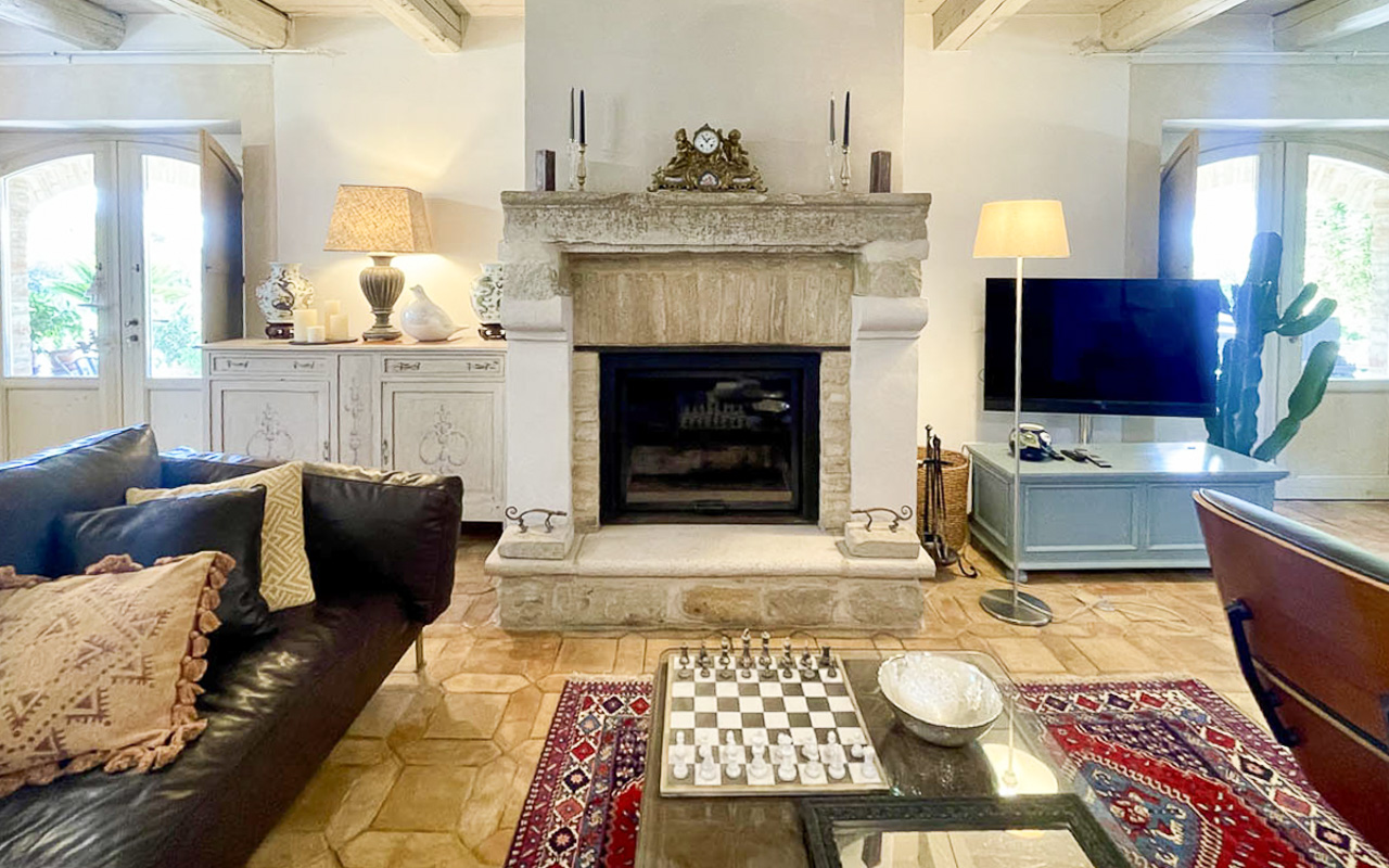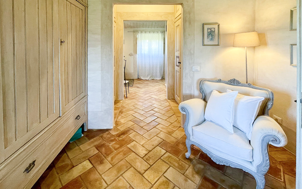 Binnen bevindt zich op de begane grond een ruime hal met een Trani-stenen trap naar de bovenverdieping. De lichte woonkamer beschikt over een thermo-open haard, grote openslaande deuren naar de tuin en toegang tot de portico, ideaal als zomerlounge. De volledig uitgeruste keuken met bijkeuken en wasruimte is functioneel en stijlvol. Op de begane grond bevindt zich tevens een kantoor of logeerkamer met eigen badkamer.