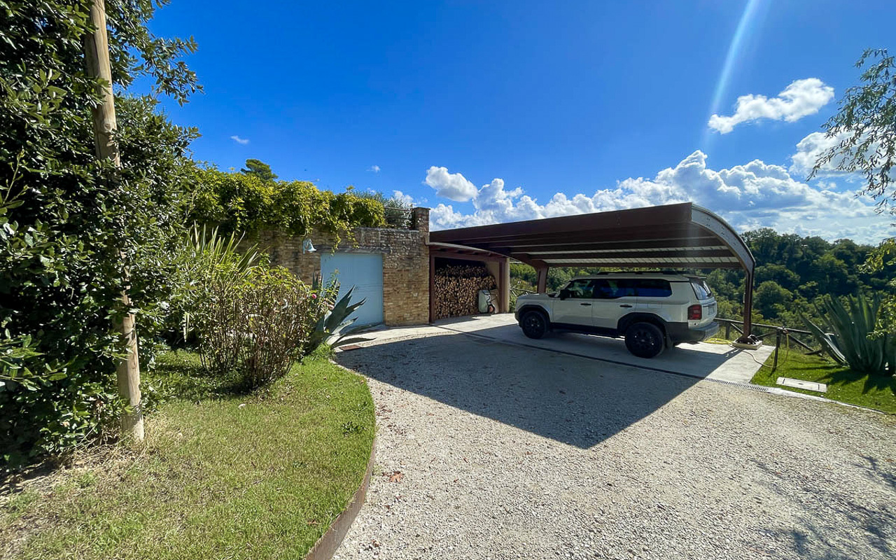 De villa is gemakkelijk bereikbaar via een gemeentelijke weg en volledig omheind. Het aangelegde perceel van circa 3.000 m² is beplant met cipressen, fruitbomen, olijfbomen en mediterrane planten, en biedt volledige privacy en rust. Een elektrische toegangspoort leidt naar de parkeerplaats en de carport.