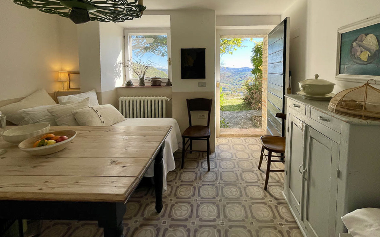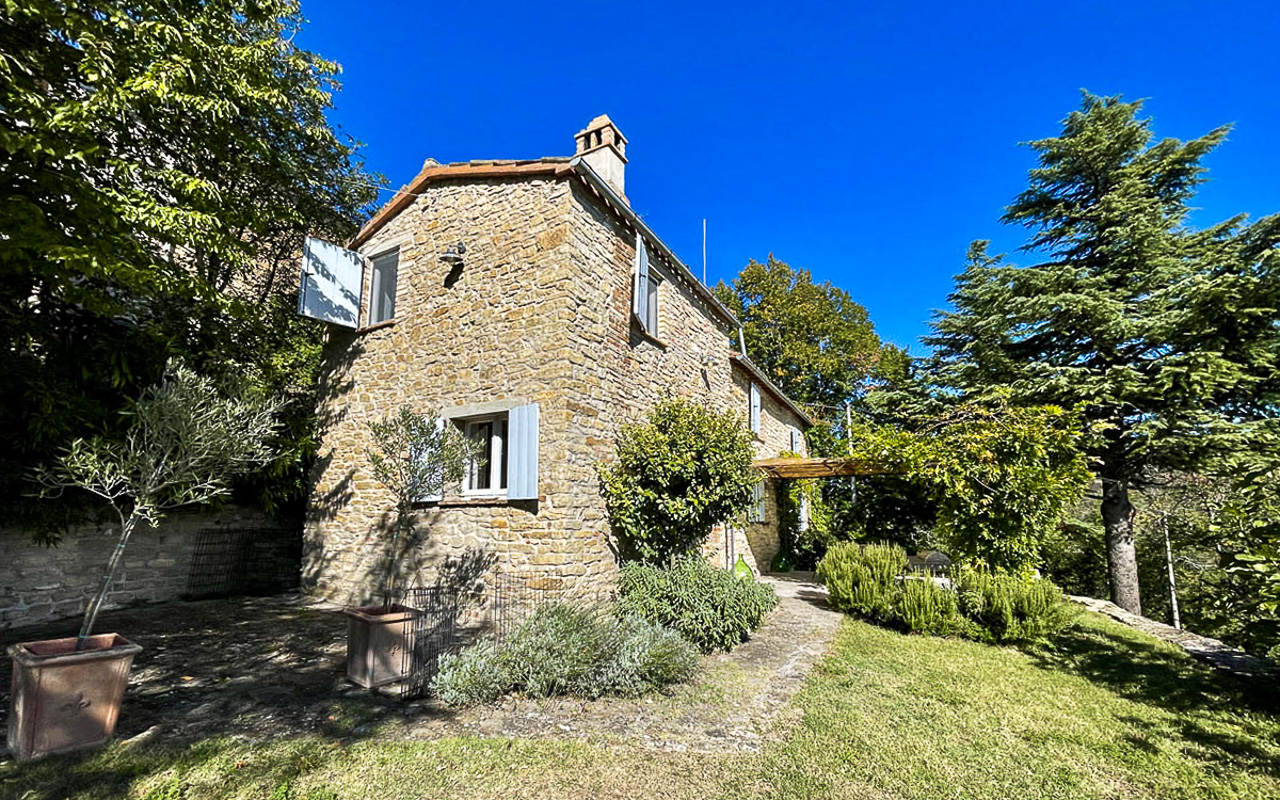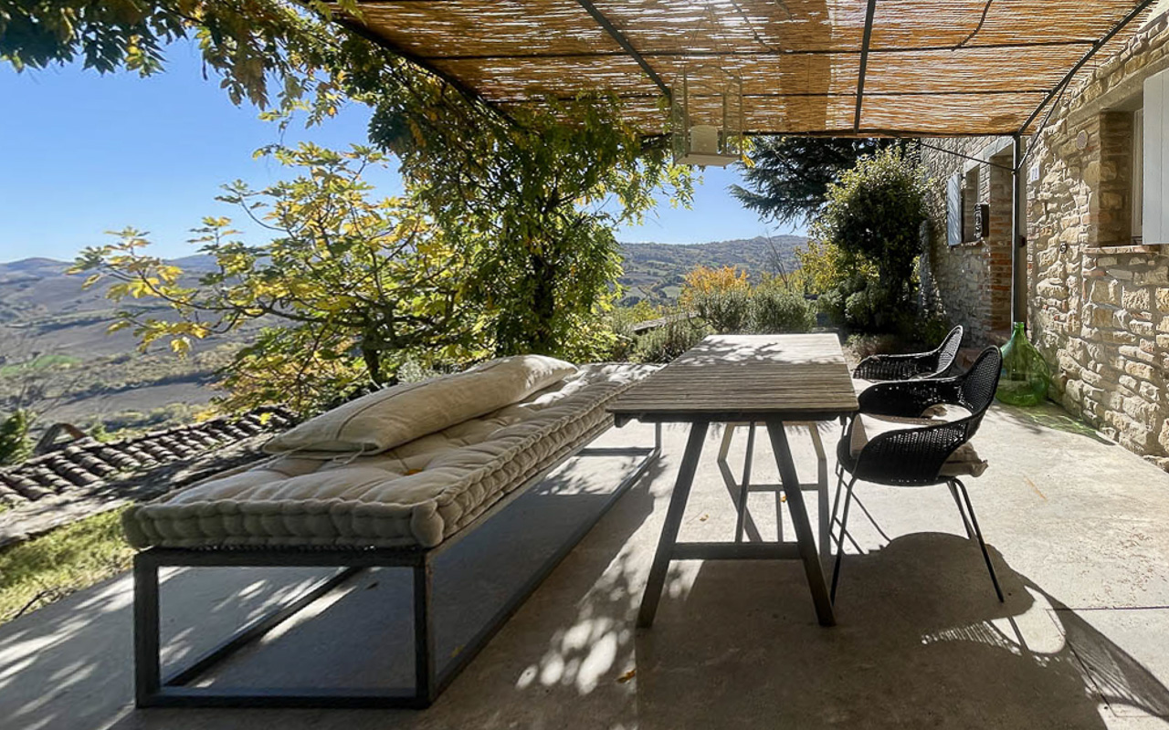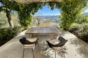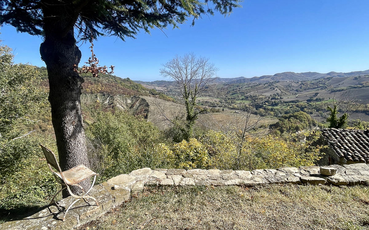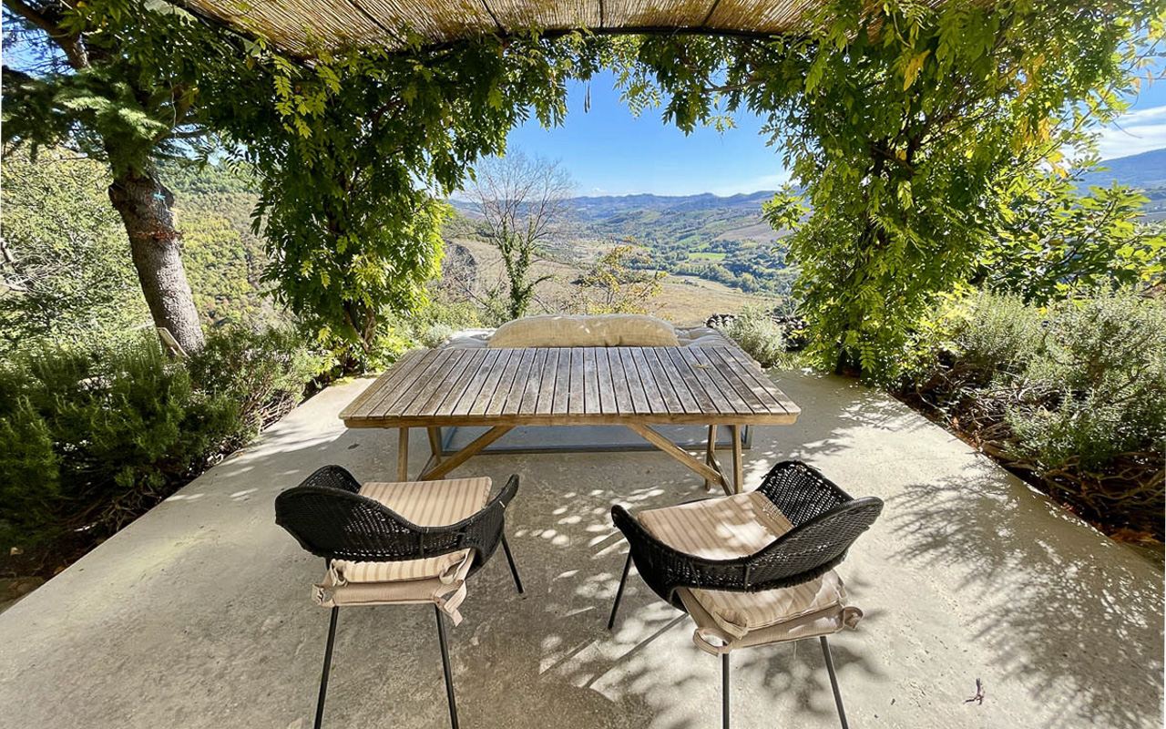 De woning bevindt zich aan de rand van een eeuwenoud, klein landelijk gehucht en kijkt uit op het zuidoosten. Vanaf hier geniet u van een vrij uitzicht over de Aso-vallei, de omliggende heuvelruggen en de middeleeuwse dorpjes die de heuveltoppen bekronen. De privétuin van circa 2.000 m² is aangelegd in terrassen en biedt meerdere sfeervolle plekken om buiten te eten, te ontspannen en van het uitzicht te genieten.