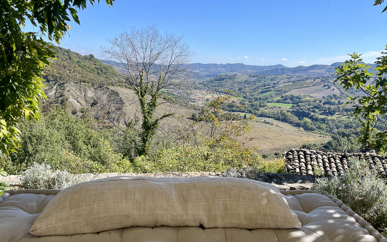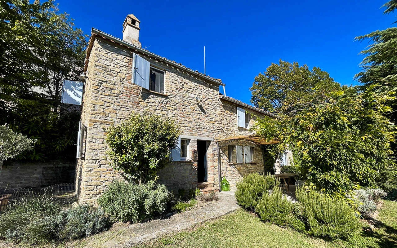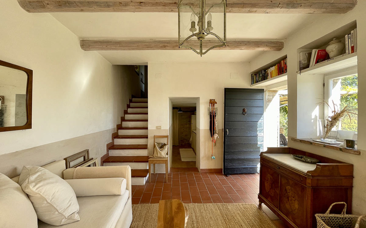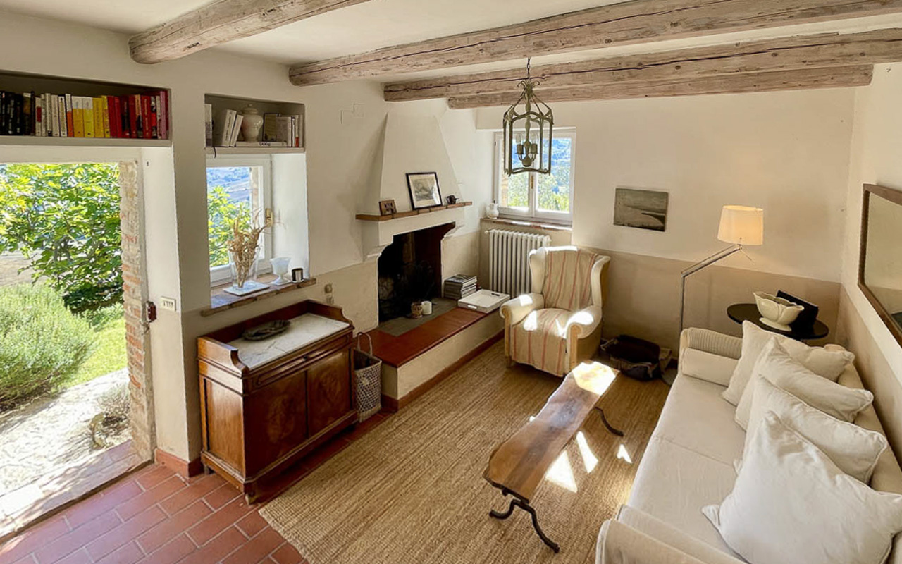 De woning bevindt zich aan de rand van een eeuwenoud, klein landelijk gehucht en kijkt uit op het zuidoosten. Vanaf hier geniet u van een vrij uitzicht over de Aso-vallei, de omliggende heuvelruggen en de middeleeuwse dorpjes die de heuveltoppen bekronen. De privétuin van circa 2.000 m² is aangelegd in terrassen en biedt meerdere sfeervolle plekken om buiten te eten, te ontspannen en van het uitzicht te genieten.