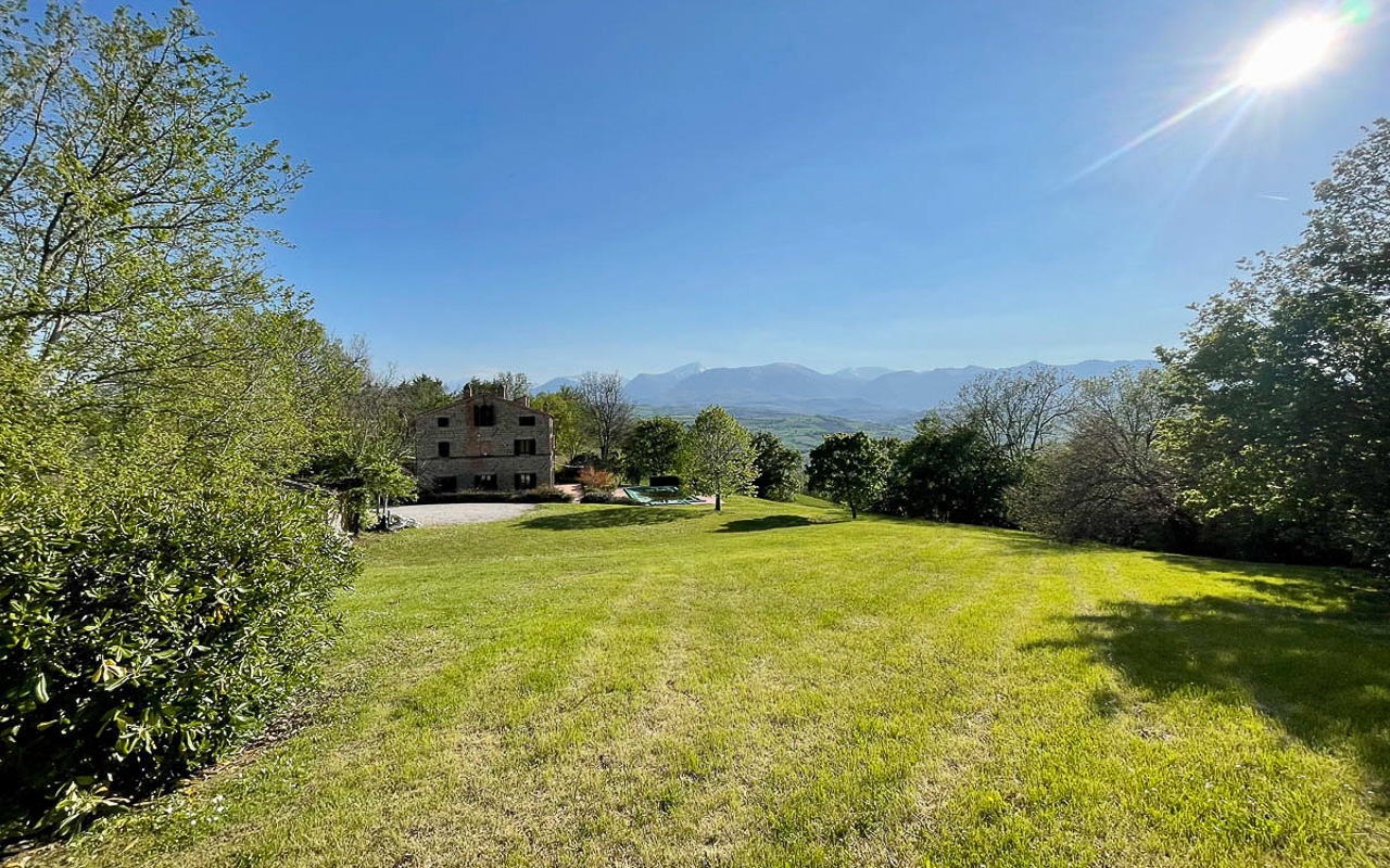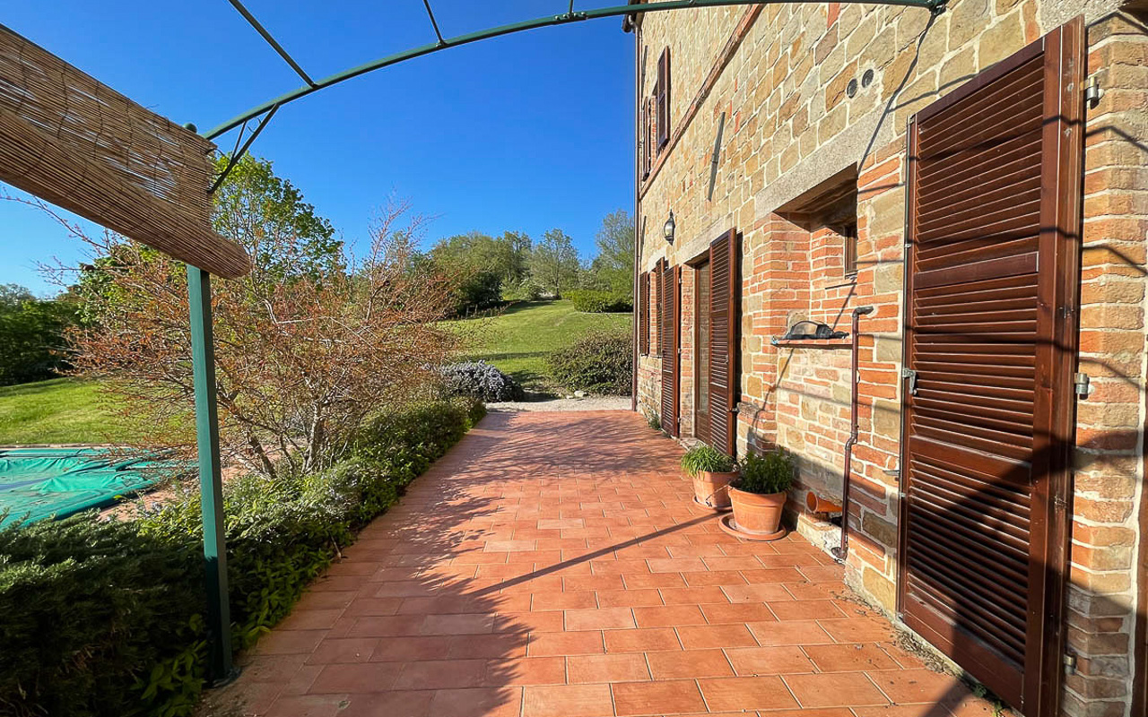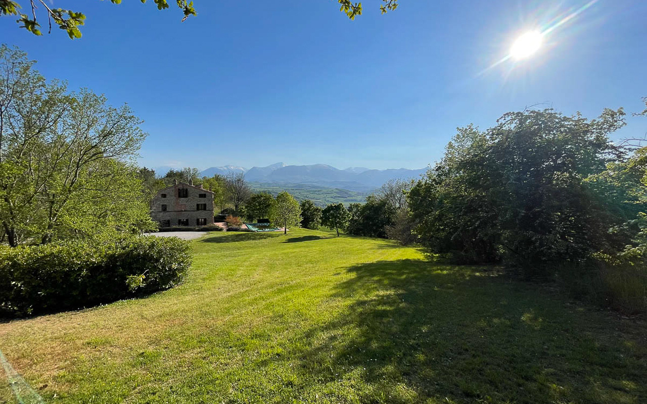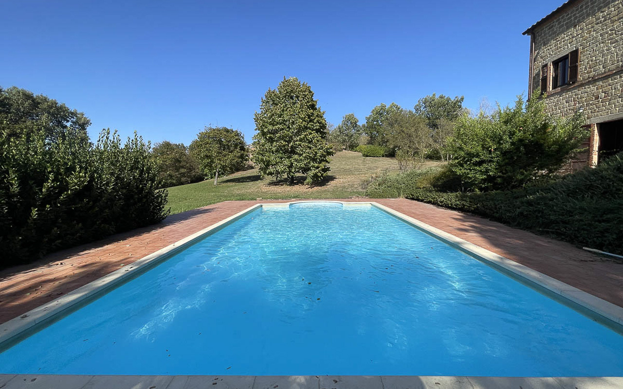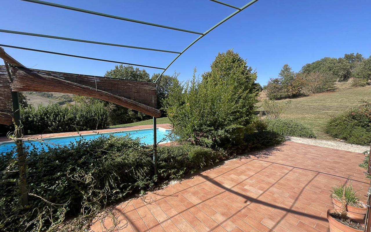 De woning wordt omringd door circa 4.000 m² tuin met volwassen beplanting en betoverende vergezichten over het landschap. Het privézwembad met zonneterras vormt een idyllische plek voor buiten dineren, ontspannen of genieten van de Italiaanse zon.