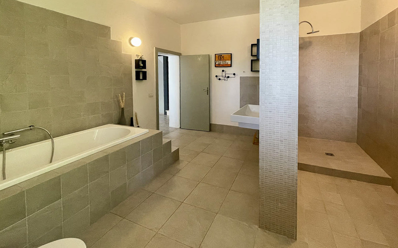 Een interne trap leidt naar de eerste verdieping, waar een ruime overloop met toegang tot een panoramisch balkon de verschillende vertrekken verbindt. Hier bevinden zich drie tweepersoonsslaapkamers, waaronder een master bedroom met en-suite badkamer met douche. Daarnaast is er een tweede badkamer met zowel een ruime douche als een ligbad.