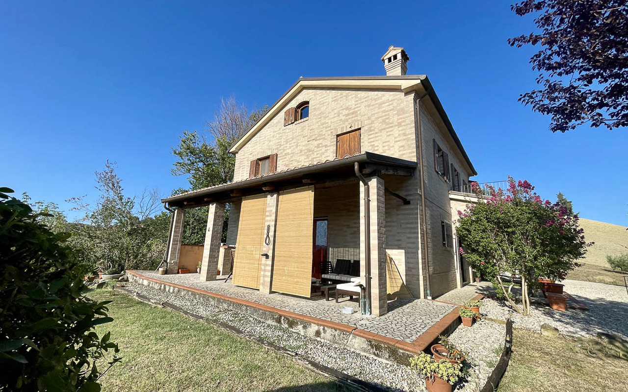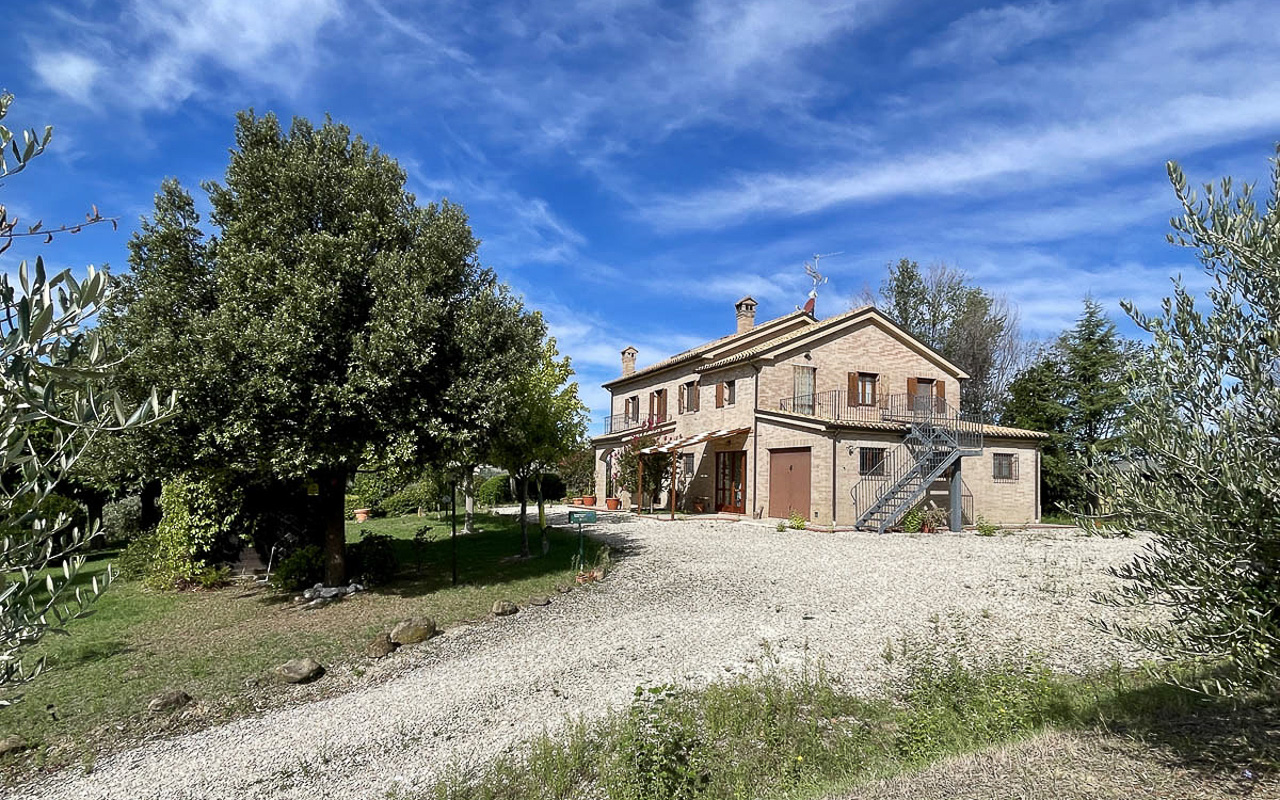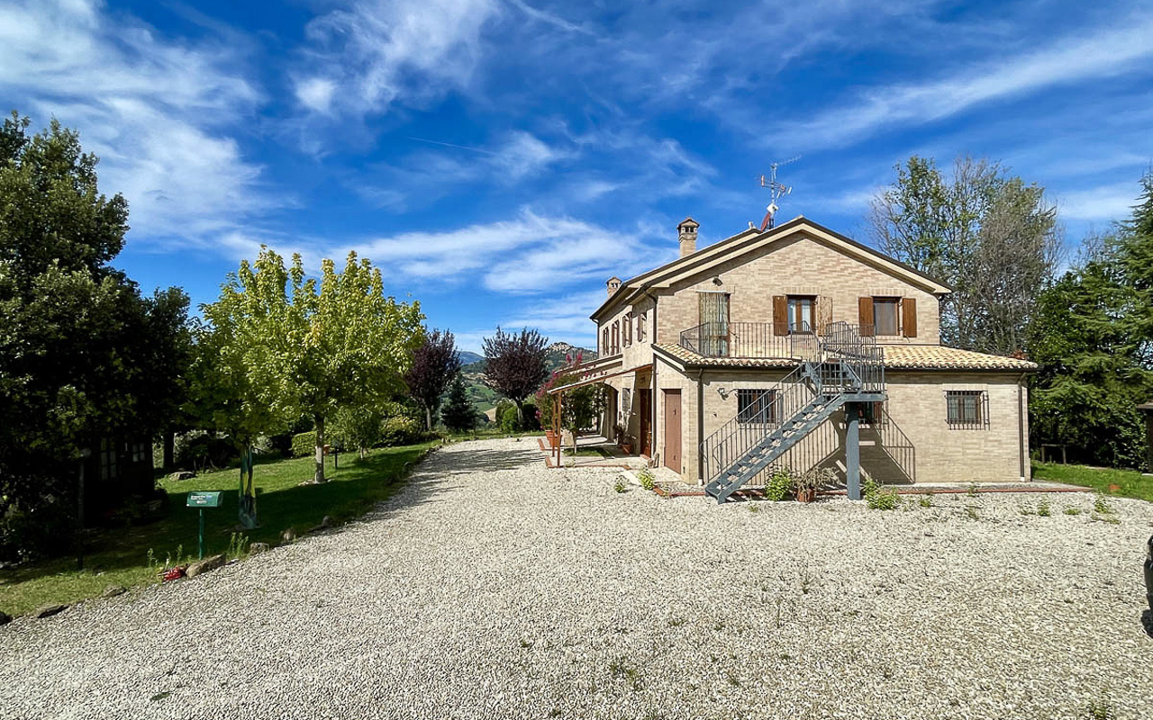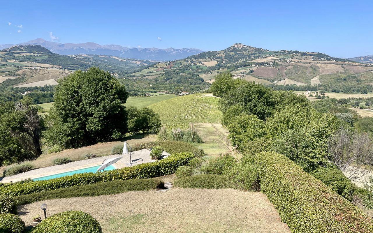 De woning staat op een dominante locatie en geniet van adembenemende open uitzichten. Aan de zuidkant strekt het landschap zich uit over glooiende heuvels met historische dorpjes op de top van de heuvels, velden en bossen, met de majestueuze Sibillini‑bergen als dramatisch decor. Aan de noordkant beschermt de zachte helling van de achterliggende heuvel tegen de winterse winden.