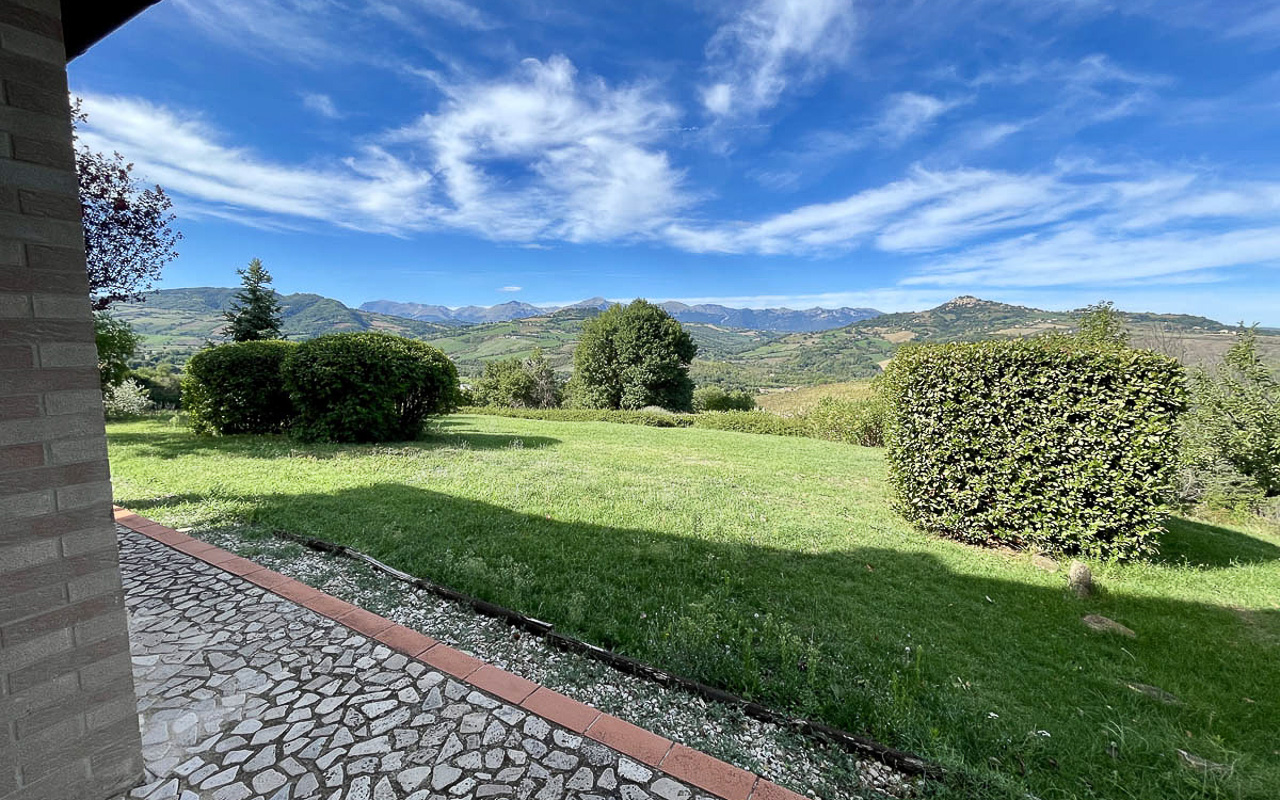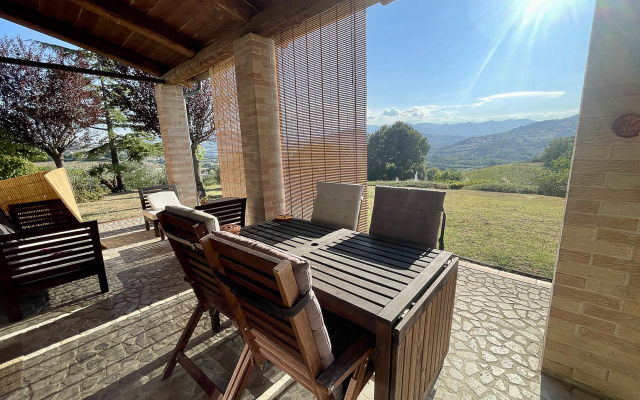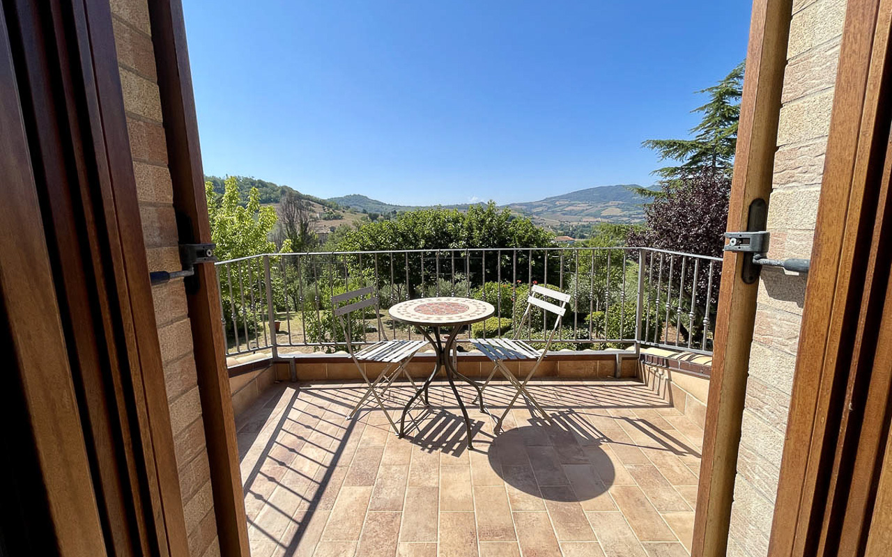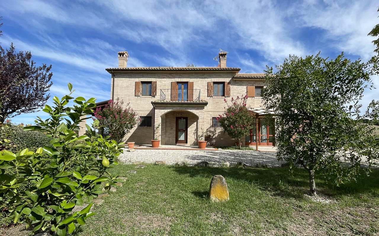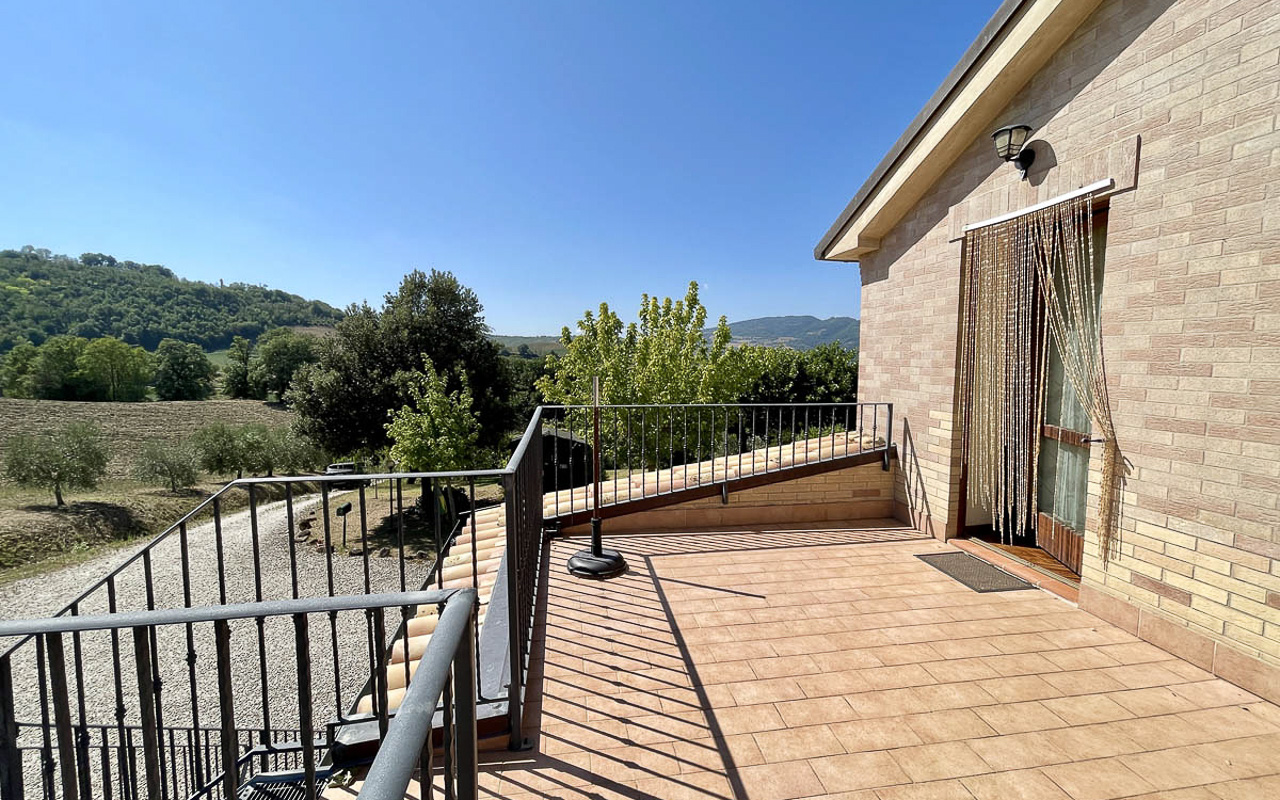 De woning staat op een dominante locatie en geniet van adembenemende open uitzichten. Aan de zuidkant strekt het landschap zich uit over glooiende heuvels met historische dorpjes op de top van de heuvels, velden en bossen, met de majestueuze Sibillini‑bergen als dramatisch decor. Aan de noordkant beschermt de zachte helling van de achterliggende heuvel tegen de winterse winden.
