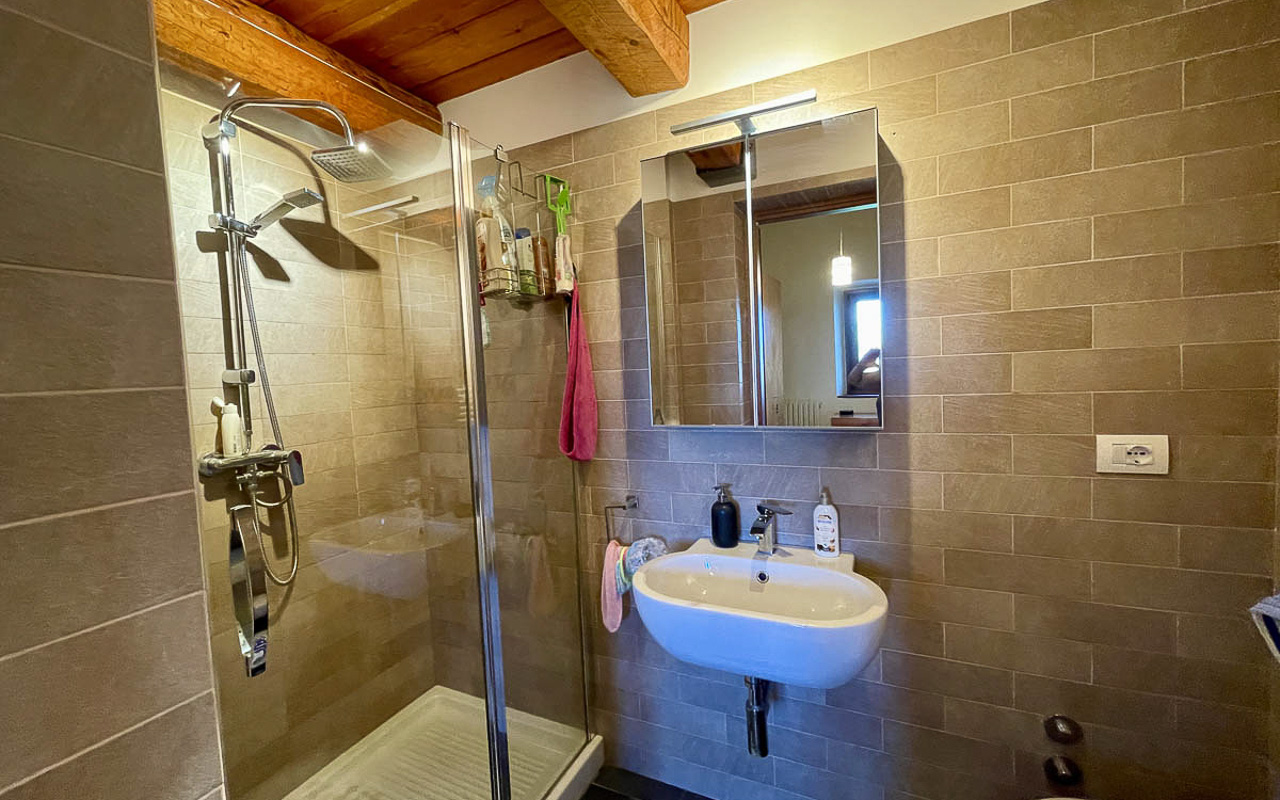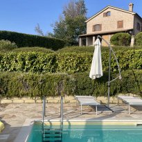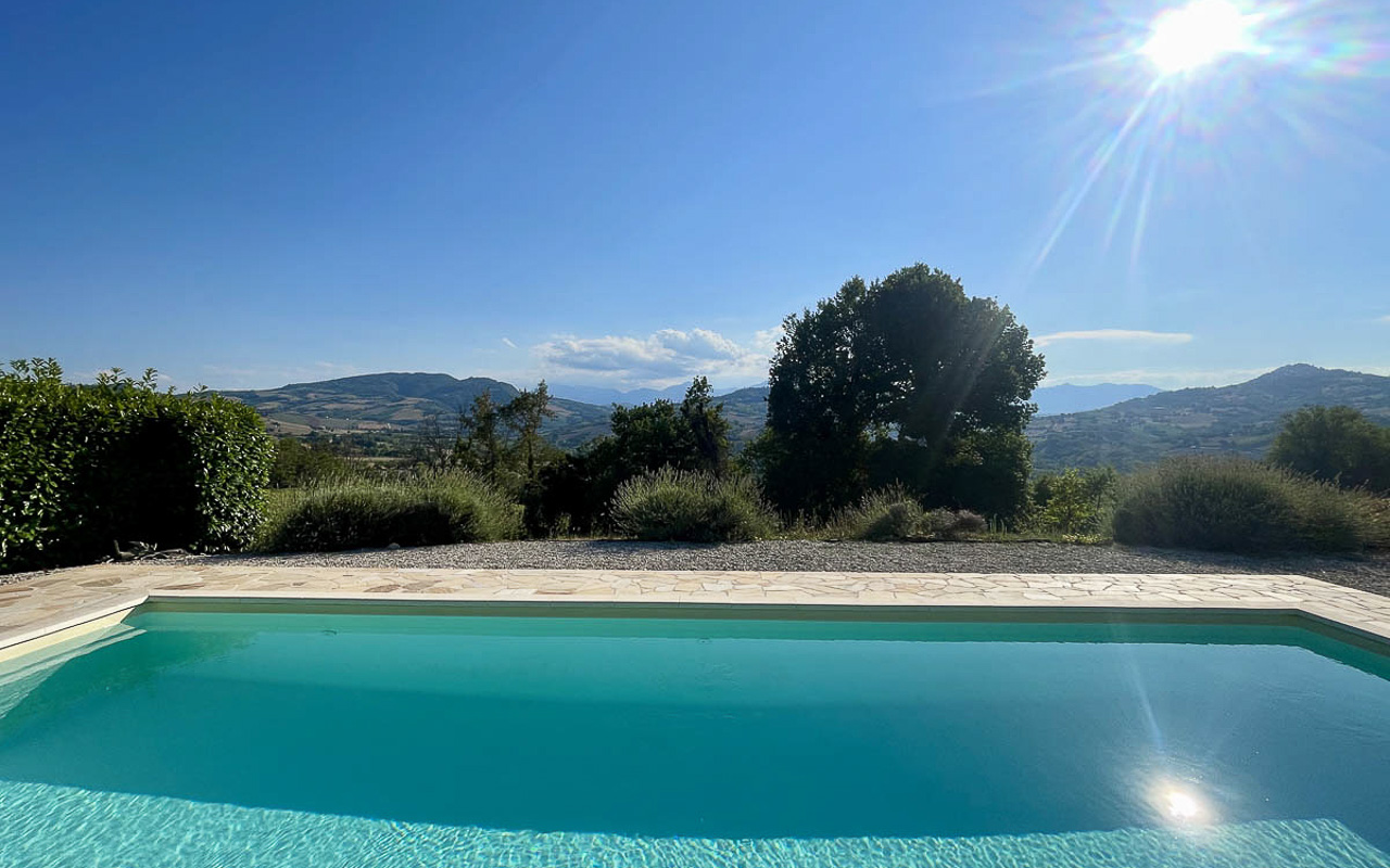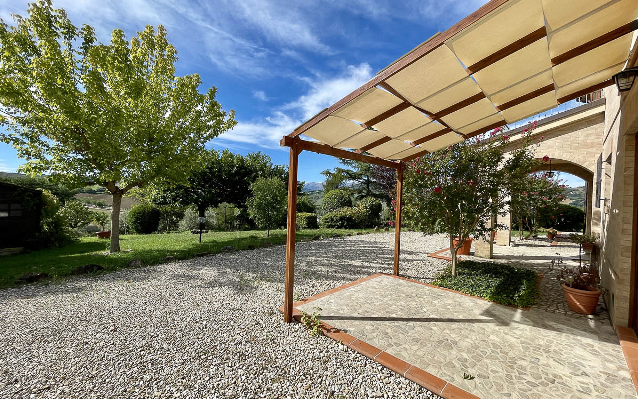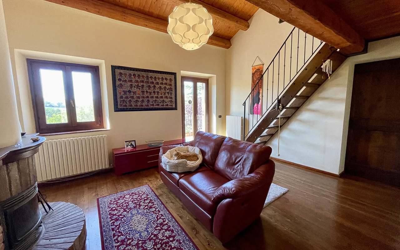 De woning staat op een dominante locatie en geniet van adembenemende open uitzichten. Aan de zuidkant strekt het landschap zich uit over glooiende heuvels met historische dorpjes op de top van de heuvels, velden en bossen, met de majestueuze Sibillini‑bergen als dramatisch decor. Aan de noordkant beschermt de zachte helling van de achterliggende heuvel tegen de winterse winden.