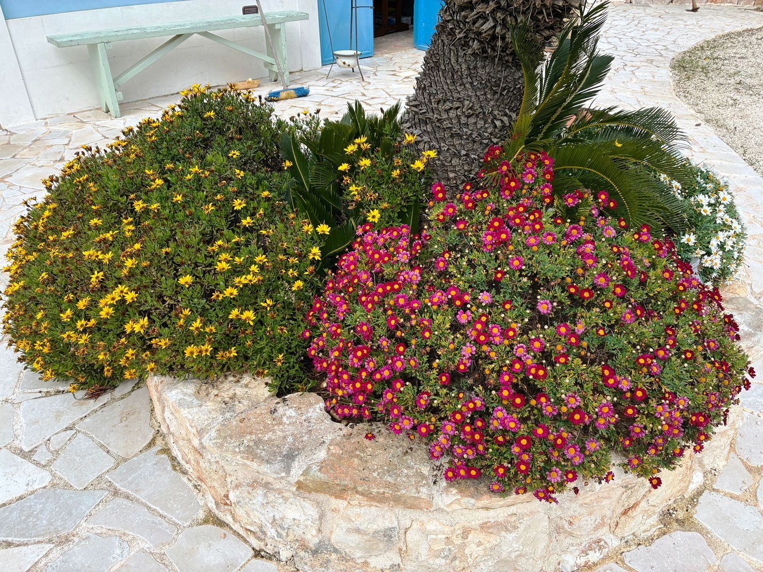Buiten bevindt zich een ruim erf met een oude binnenplaats, omgeven door een perceel van circa 20.000 m² met traditionele droge stenen muren.