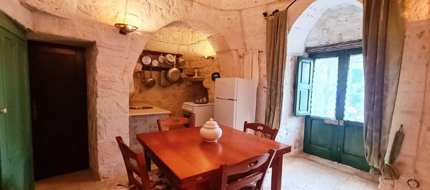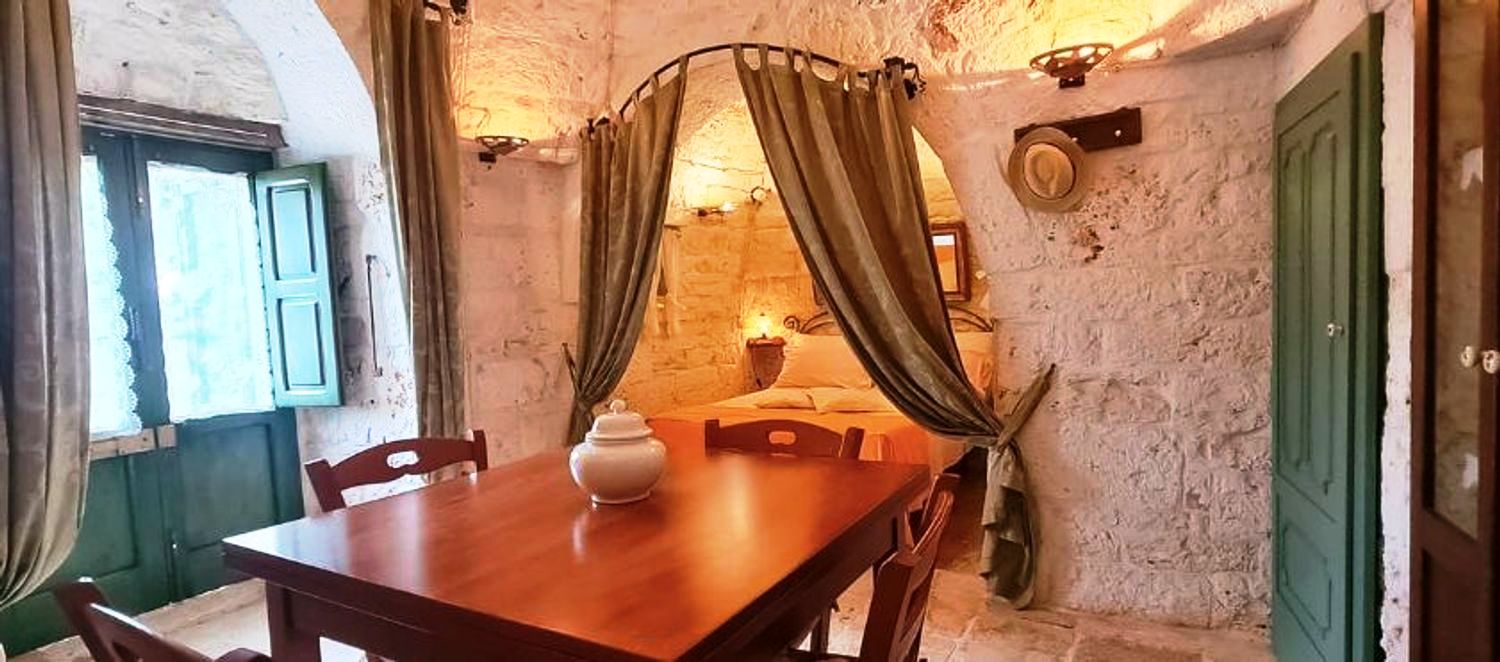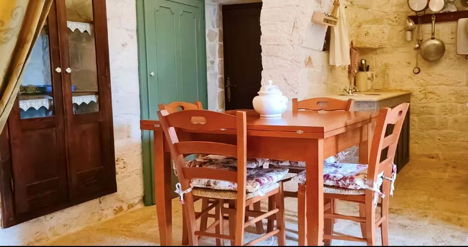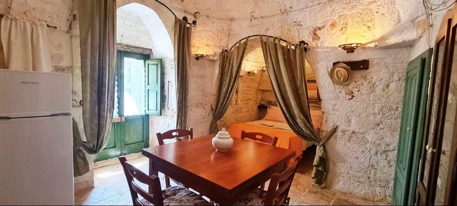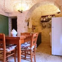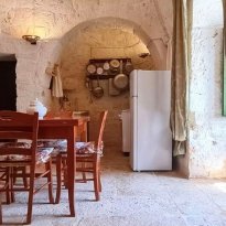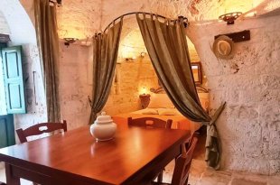 Met respect voor de landelijke architectuur van die periode werd de trullo gerestaureerd en in ere hersteld. Binnen bevindt zich de prachtige originele "chianche"-vloer, met de zichtbare stenen koepels en houten elementen en nissen, waar de kleuren in een ongelooflijk kleurenspel samensmelten, zoals in vervlogen tijden. Je waant je er bijna weer zoals de mensen die er 200 jaar geleden woonden.