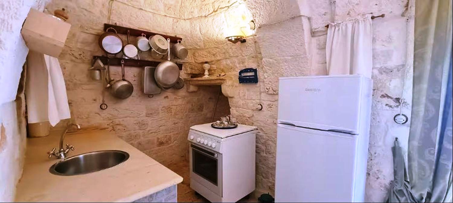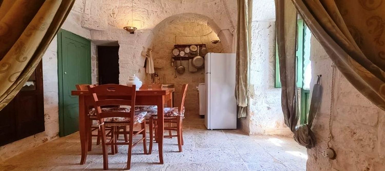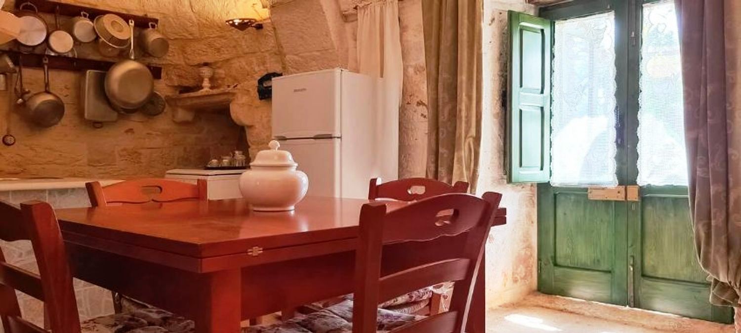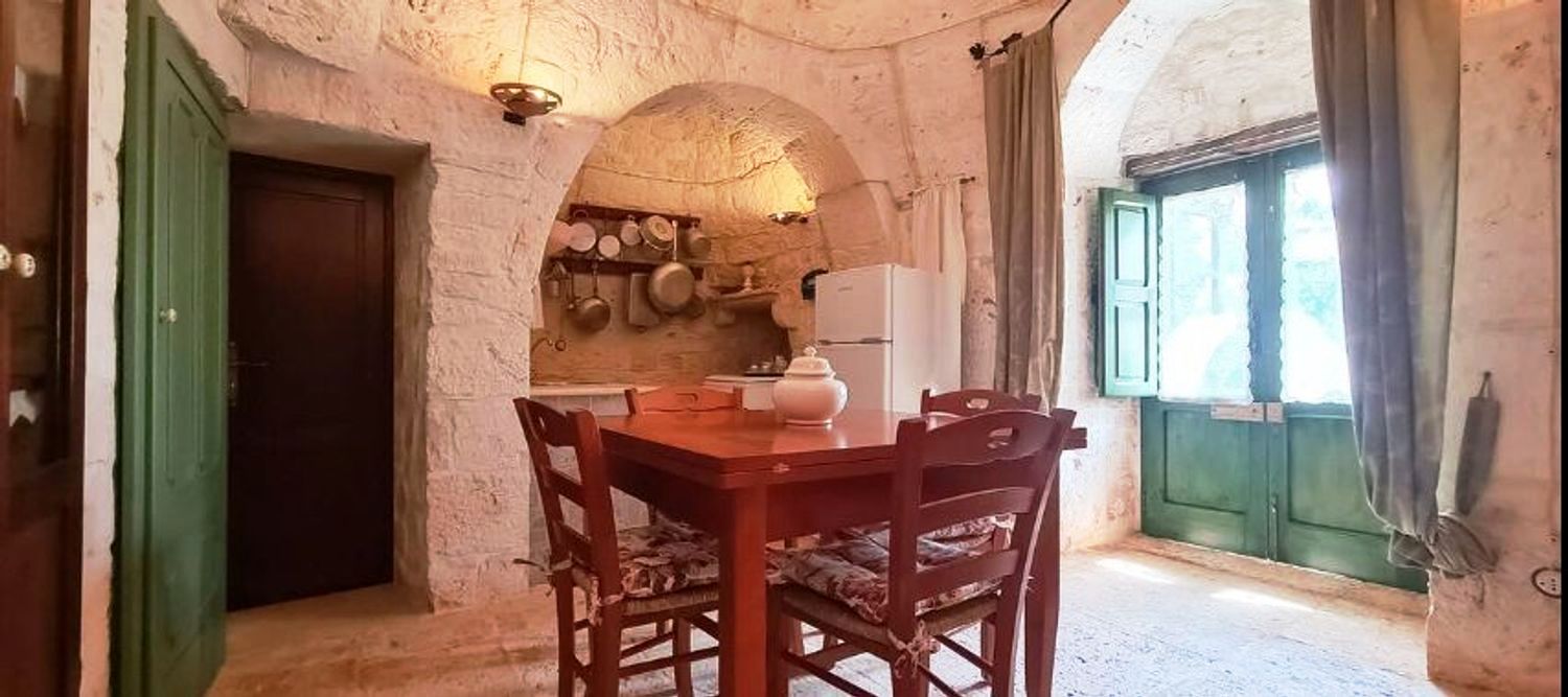 Met respect voor de landelijke architectuur van die periode werd de trullo gerestaureerd en in ere hersteld. Binnen bevindt zich de prachtige originele "chianche"-vloer, met de zichtbare stenen koepels en houten elementen en nissen, waar de kleuren in een ongelooflijk kleurenspel samensmelten, zoals in vervlogen tijden. Je waant je er bijna weer zoals de mensen die er 200 jaar geleden woonden.