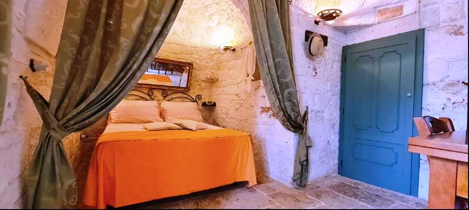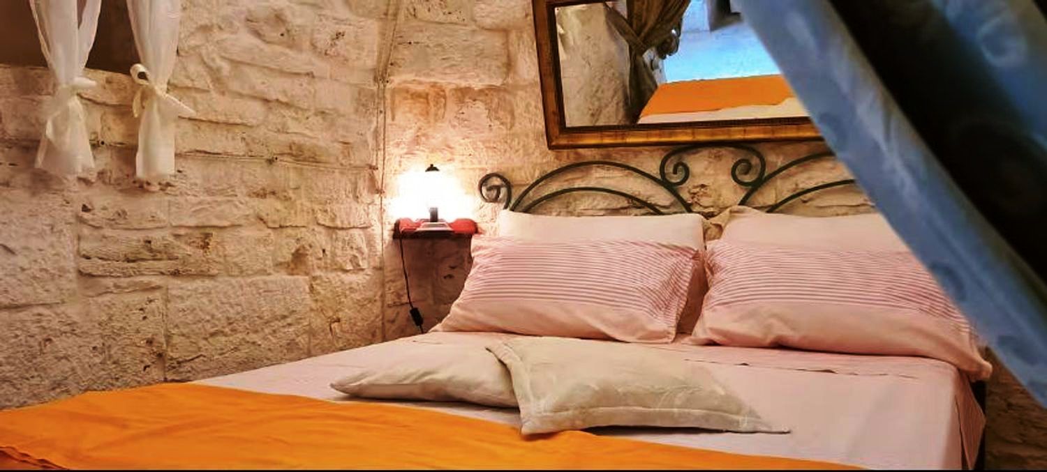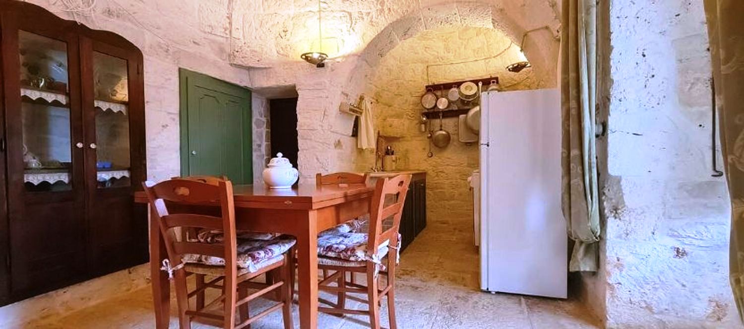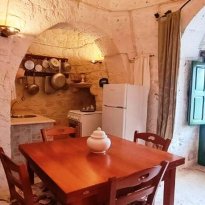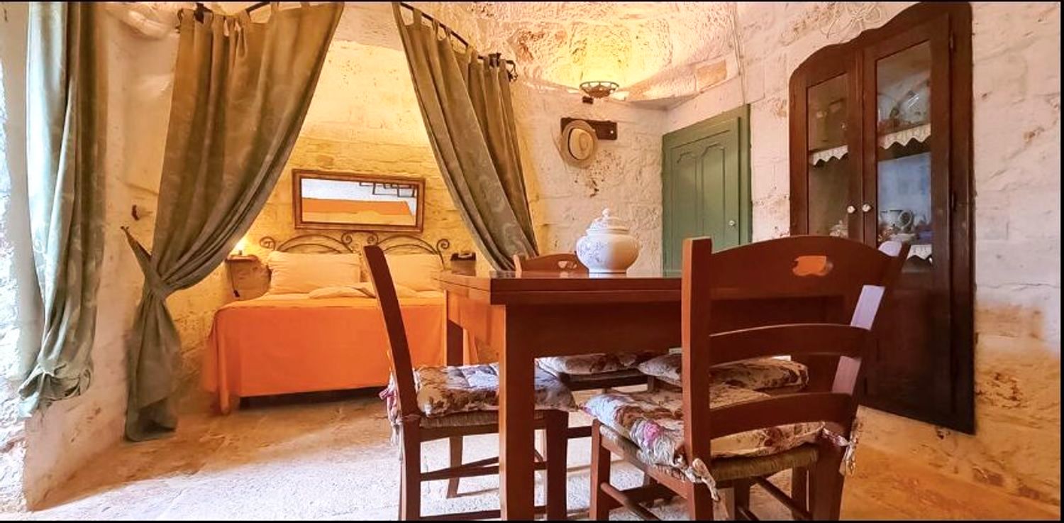 Met respect voor de landelijke architectuur van die periode werd de trullo gerestaureerd en in ere hersteld. Binnen bevindt zich de prachtige originele "chianche"-vloer, met de zichtbare stenen koepels en houten elementen en nissen, waar de kleuren in een ongelooflijk kleurenspel samensmelten, zoals in vervlogen tijden. Je waant je er bijna weer zoals de mensen die er 200 jaar geleden woonden.