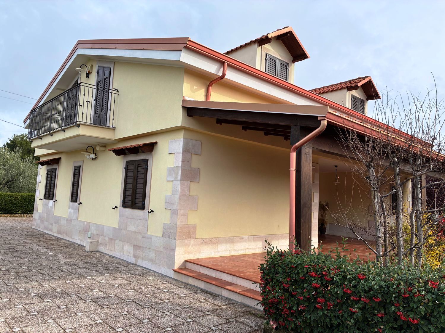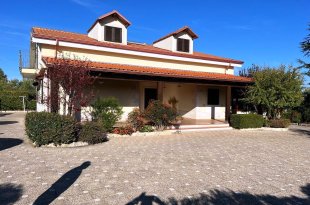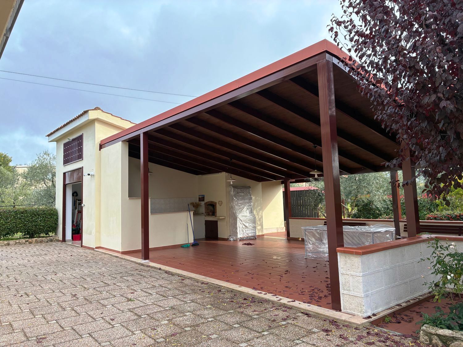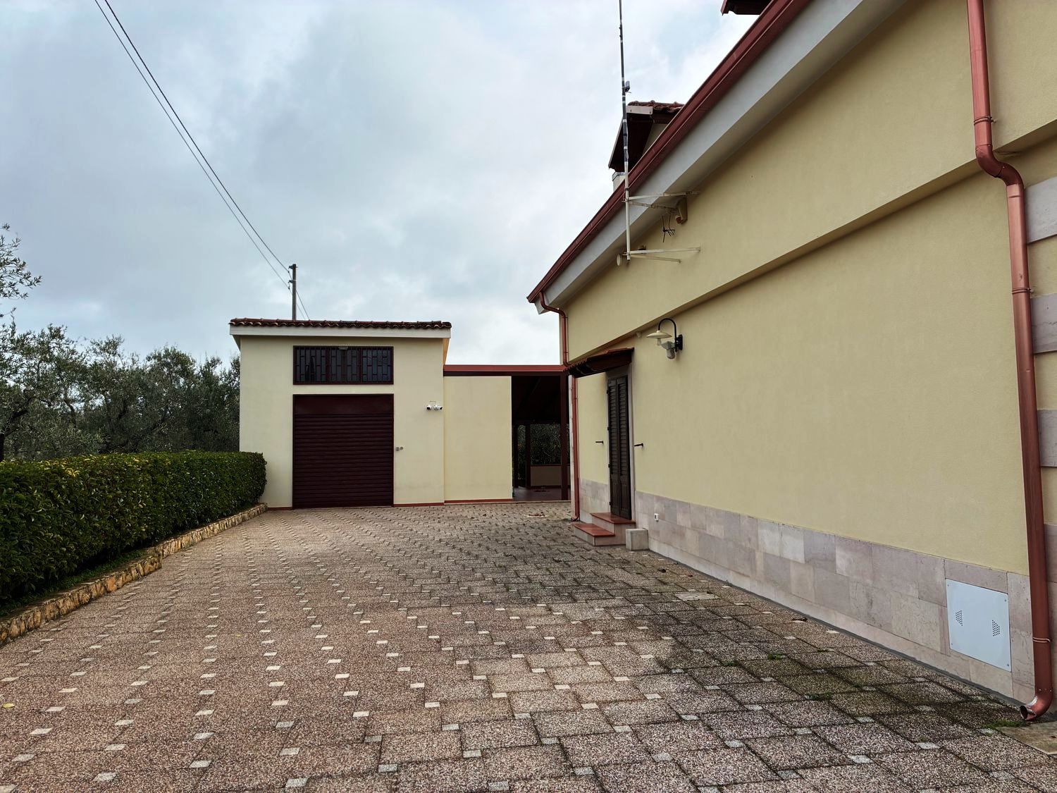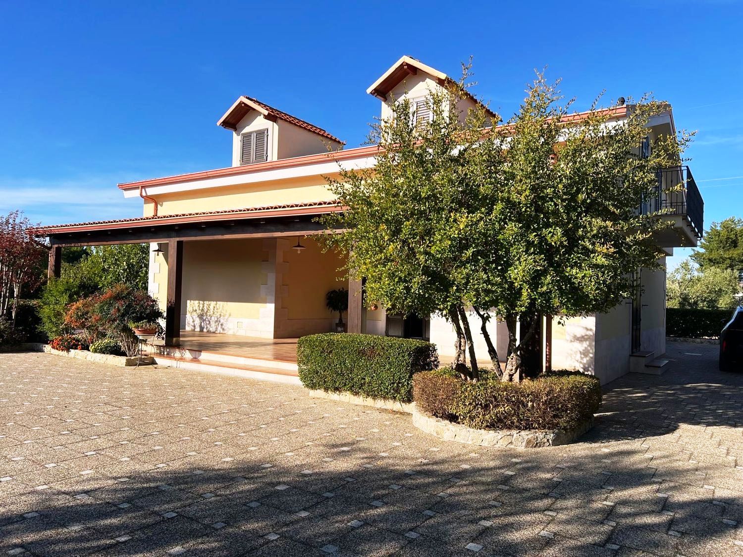 Hoogwaardige villa verdeeld over twee verdiepingen met een volledig bestraat erf, een opslagruimte met badkamer en een aangrenzende overkapping met buitenkeuken, een houten carport voor auto's en een grondstuk van circa 3.800 m² met een gemengd fruitboomgaard en olijfgaard.