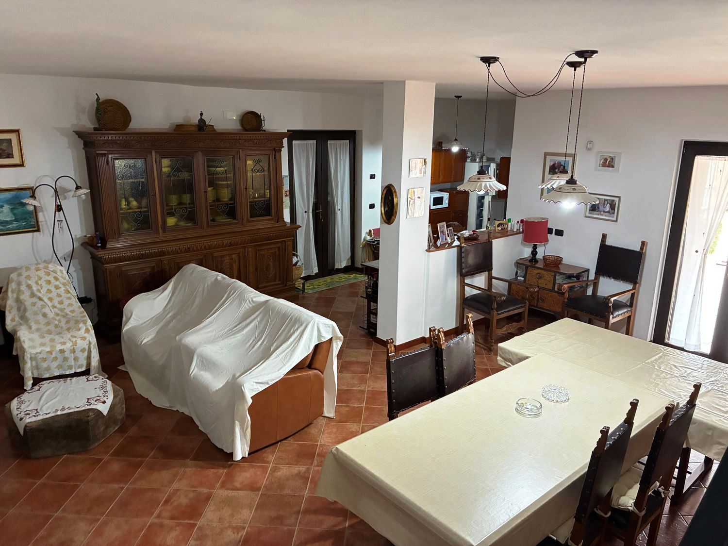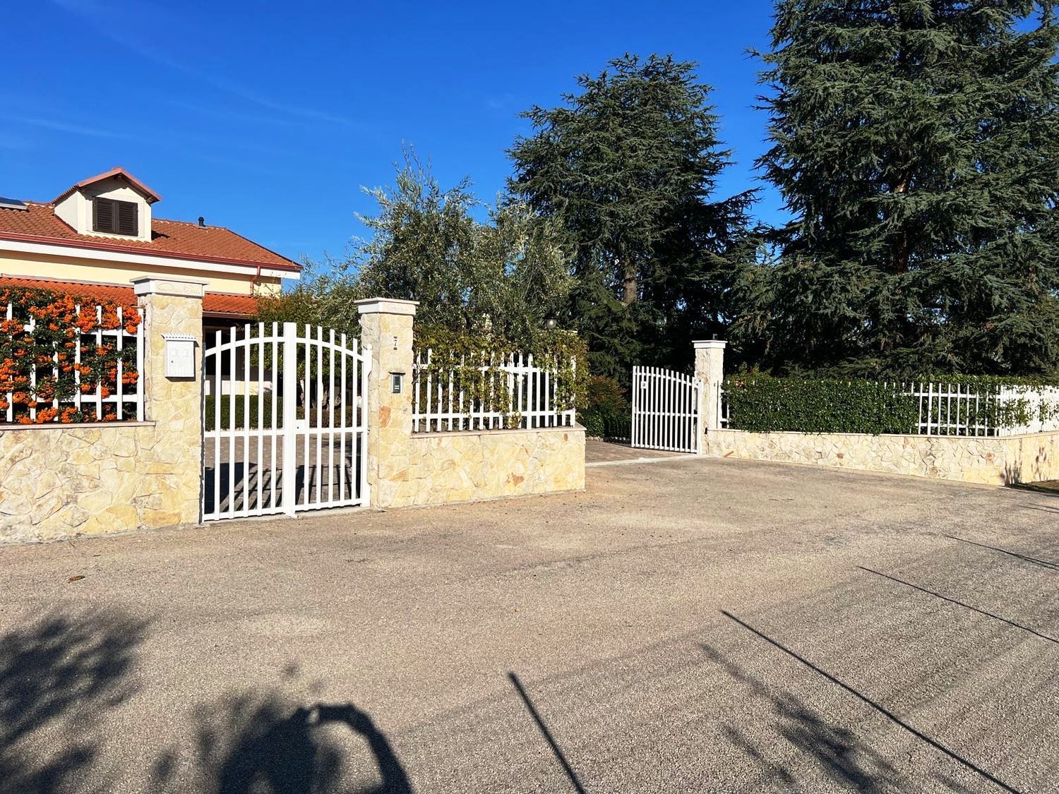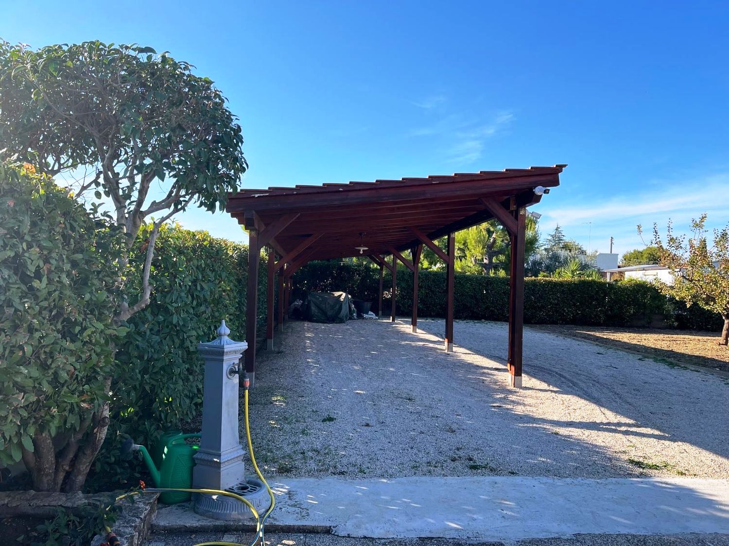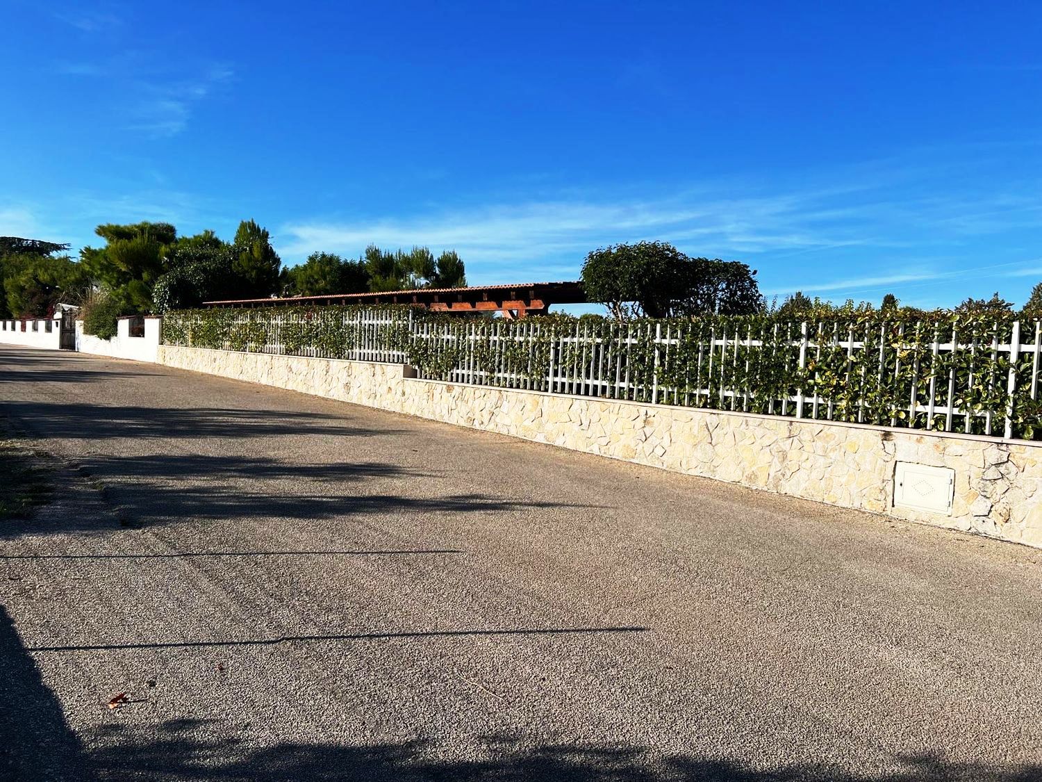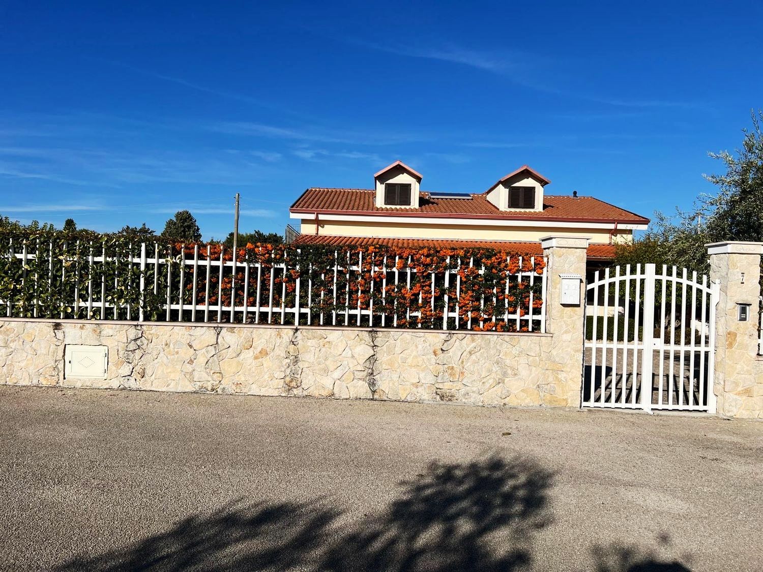 Hoogwaardige villa verdeeld over twee verdiepingen met een volledig bestraat erf, een opslagruimte met badkamer en een aangrenzende overkapping met buitenkeuken, een houten carport voor auto's en een grondstuk van circa 3.800 m² met een gemengd fruitboomgaard en olijfgaard.