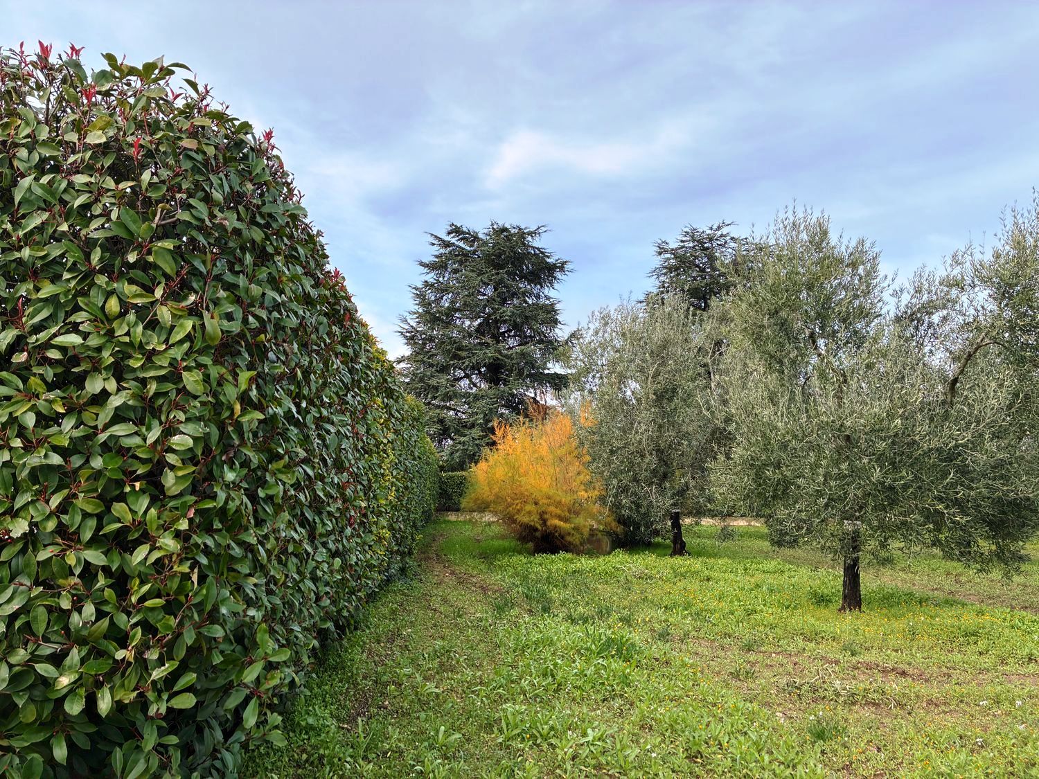 Het terrein is volledig omheind met hagen en perimetermuren.