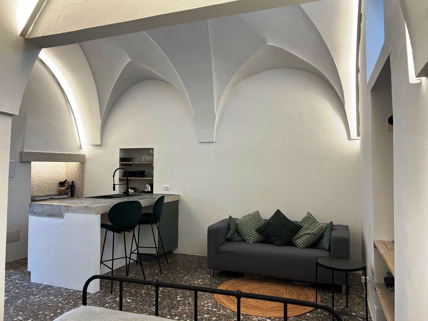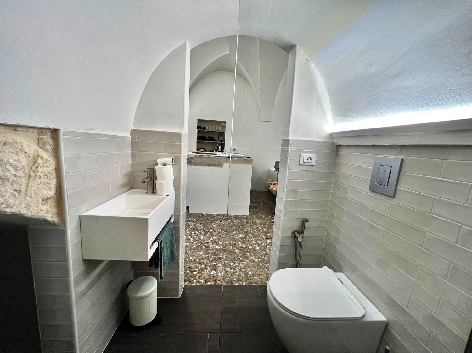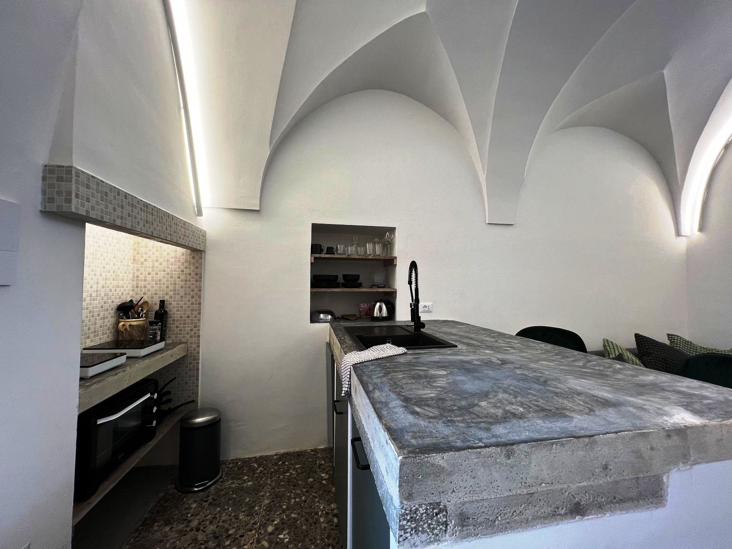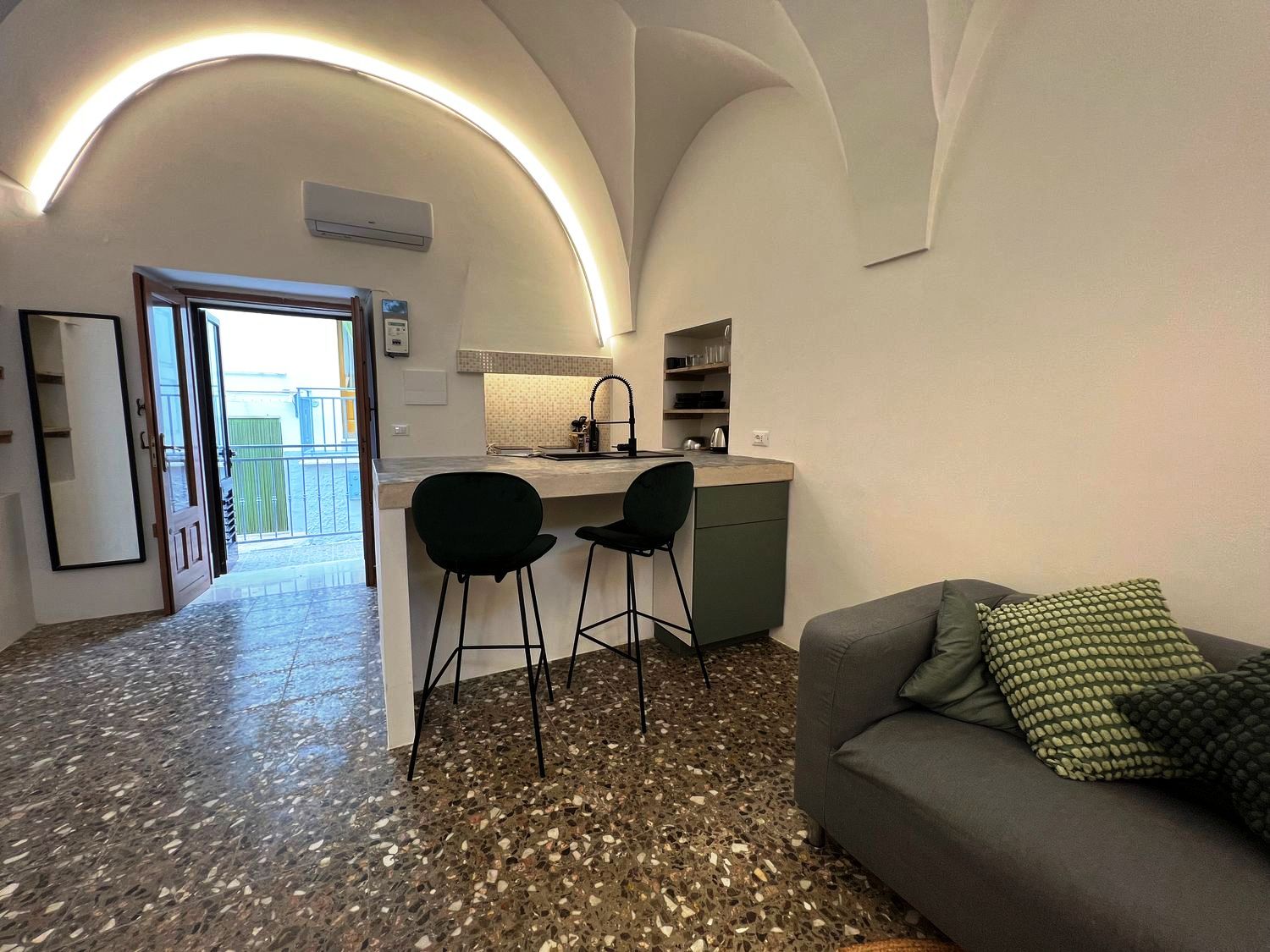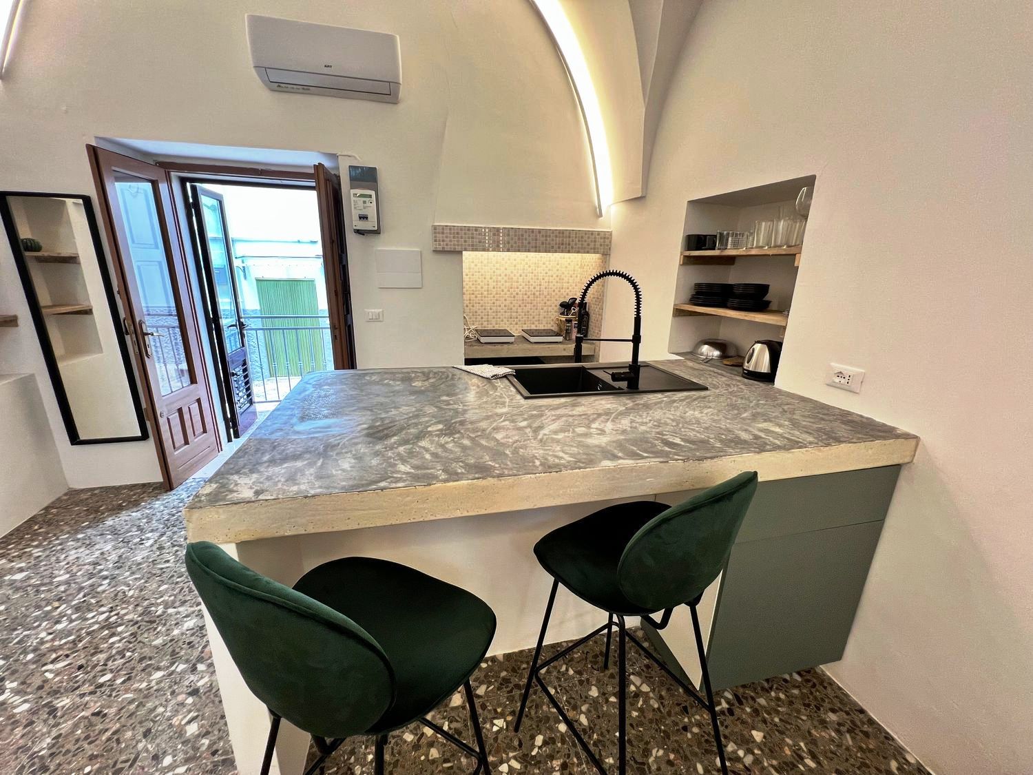 De betovering van het verleden: het huis was een oud huis van een lokale familie, volledig gerestaureerd door de huidige eigenaar, die de oude uitstraling heeft weten te herstellen en het nieuw leven heeft inblazen. Het huis is een ruim en comfortabel studio-appartement, met een tweepersoonsbed in een alkoof, een grote woonkamer met een slaapbank, een open keuken met kookeiland, een comfortabele badkamer, airconditioning en wifi. De woning beschikt over een ondergrondse berging van circa 25 m².