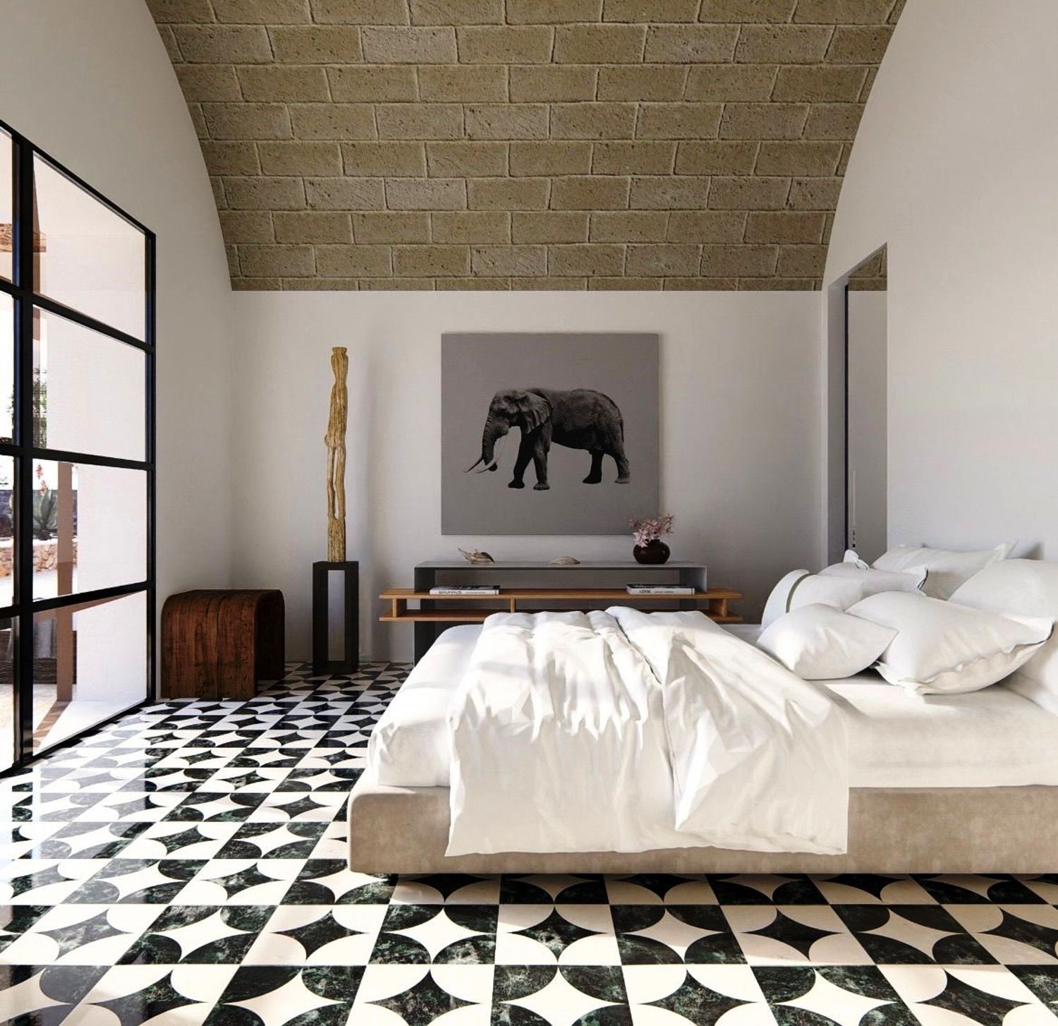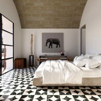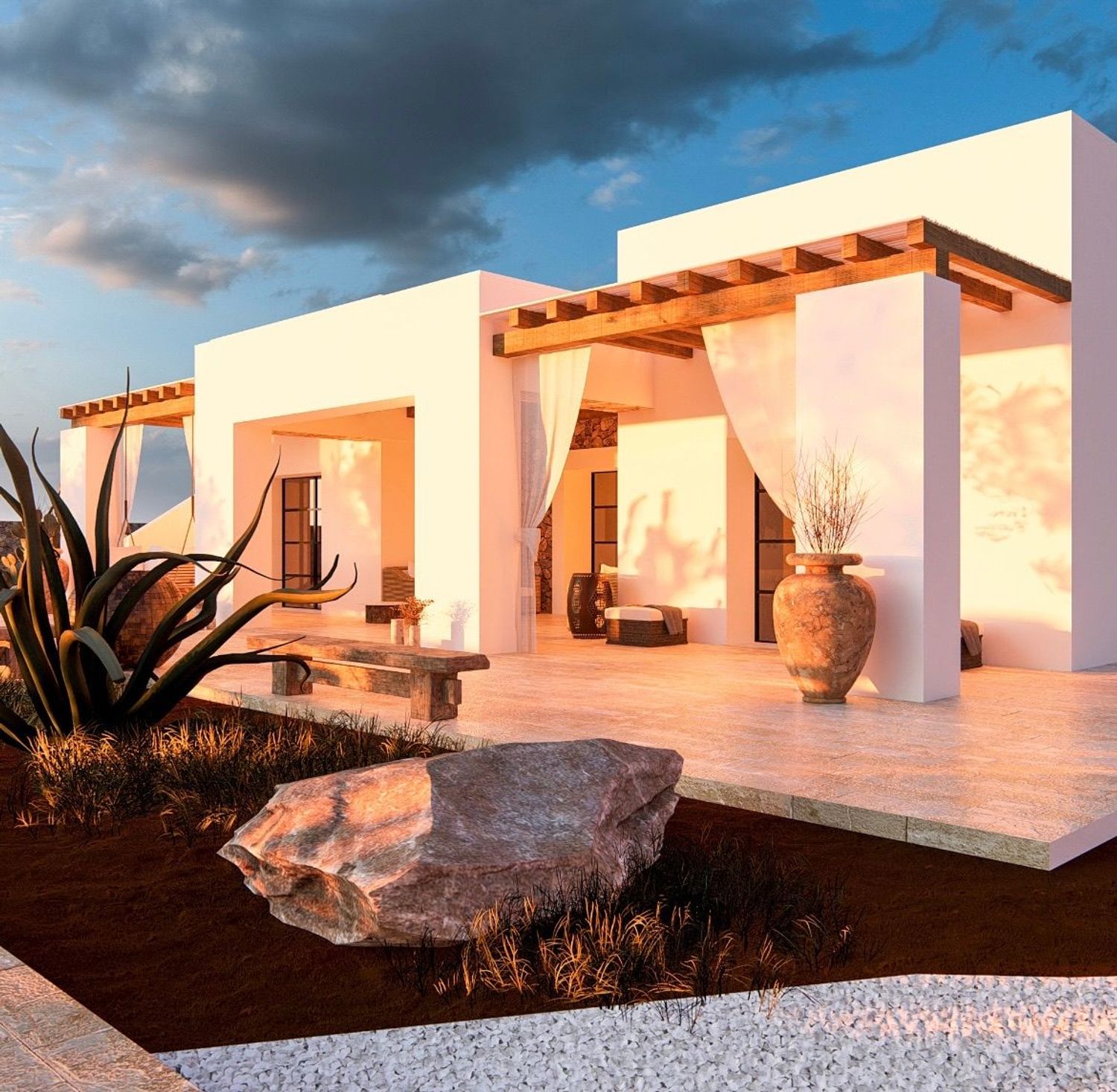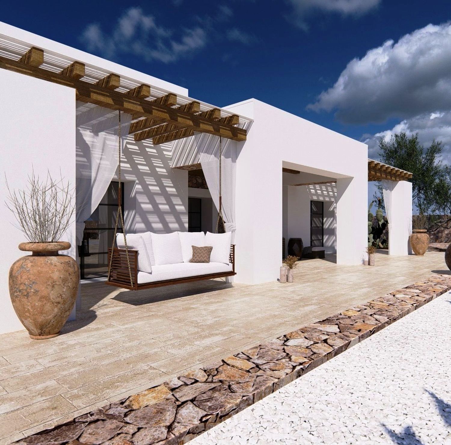 De architectuur van de villa worden gekenmerkt door strakke, moderne lijnen, verdeeld in drie vierkante modules, elk met een veranda en grote ramen met uitzicht op de tuin.