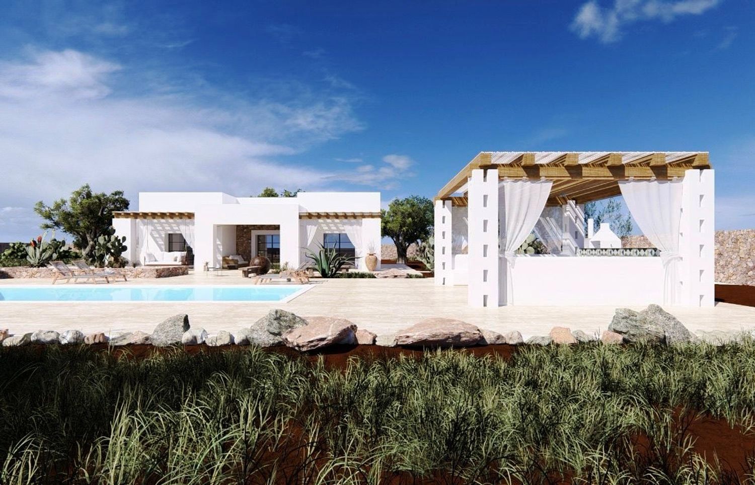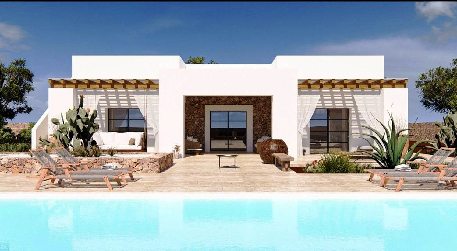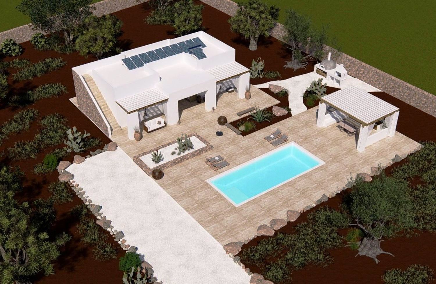 De villa zal bestaan uit twee grote slaapkamers, een woon-/eetkamer, twee badkamers, een woonkamer met keuken, een veranda, een barbecue met houtoven, een zwembad van 40 m² met een ontspanningsruimte, een panoramisch terras, een parkeerplaats en een eigen ingang.